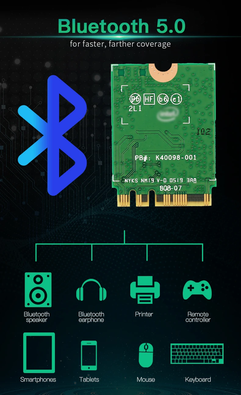 Вещь превзошла ожидания, уверенный 5g Wi-Fi, ловит Wi-Fi половины дома, блютуз работает отлично, передаёт музыку на блютуз колонку JBL go 2 почти на всю квартиру, в соседнюю комнату уверенно. работает на мат плате huananzhi x99tf, БЛЮТУЗ и Wi-Fi работает без всяких перемычек на данной плате как многие пишут, даже драйвера не устанавливал.