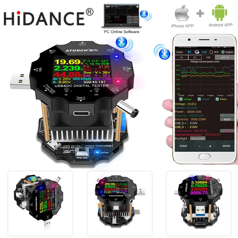 Это новый продукт! Цветной экран! Bluetooth! 8 интерфейсов! Поддержка USB, type-C, DC5525, micro USB. Он может измерять изменения напряжения и тока в процессе работы/зарядки различных инверторов постоянного тока, таких как мобильные телефоны, ноутбуки, настольные лампы, роутеры, приставки и т. Д., И может быть протестирован по Bluetooth на мобильном телефоне!