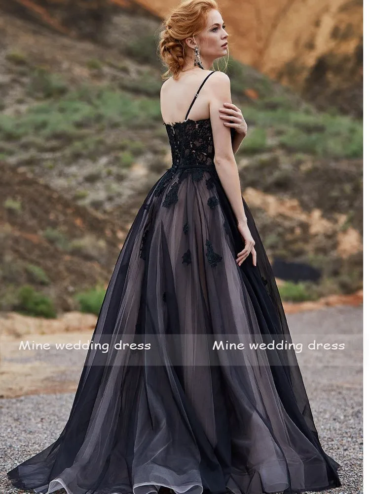 Потрясающее черное свадебное платье на бретелях с V-образным вырезом