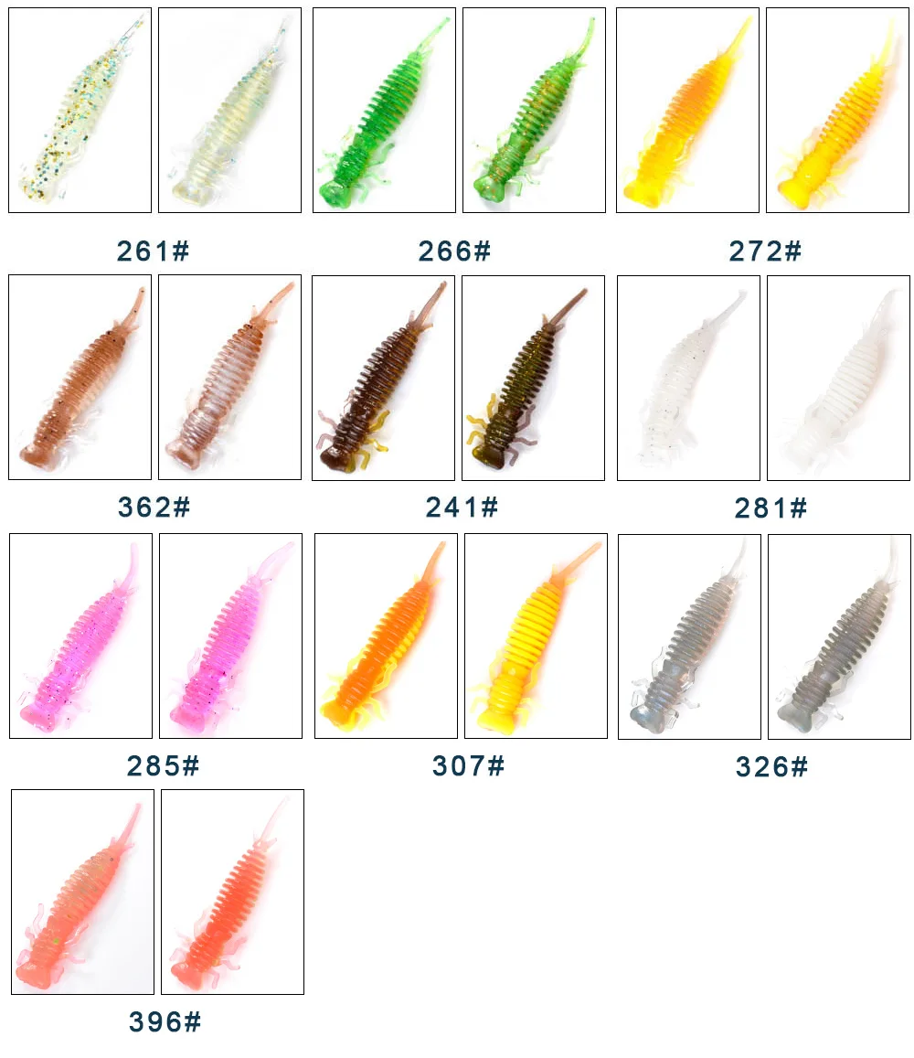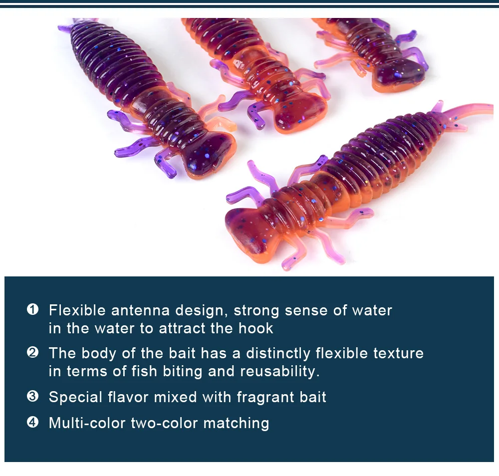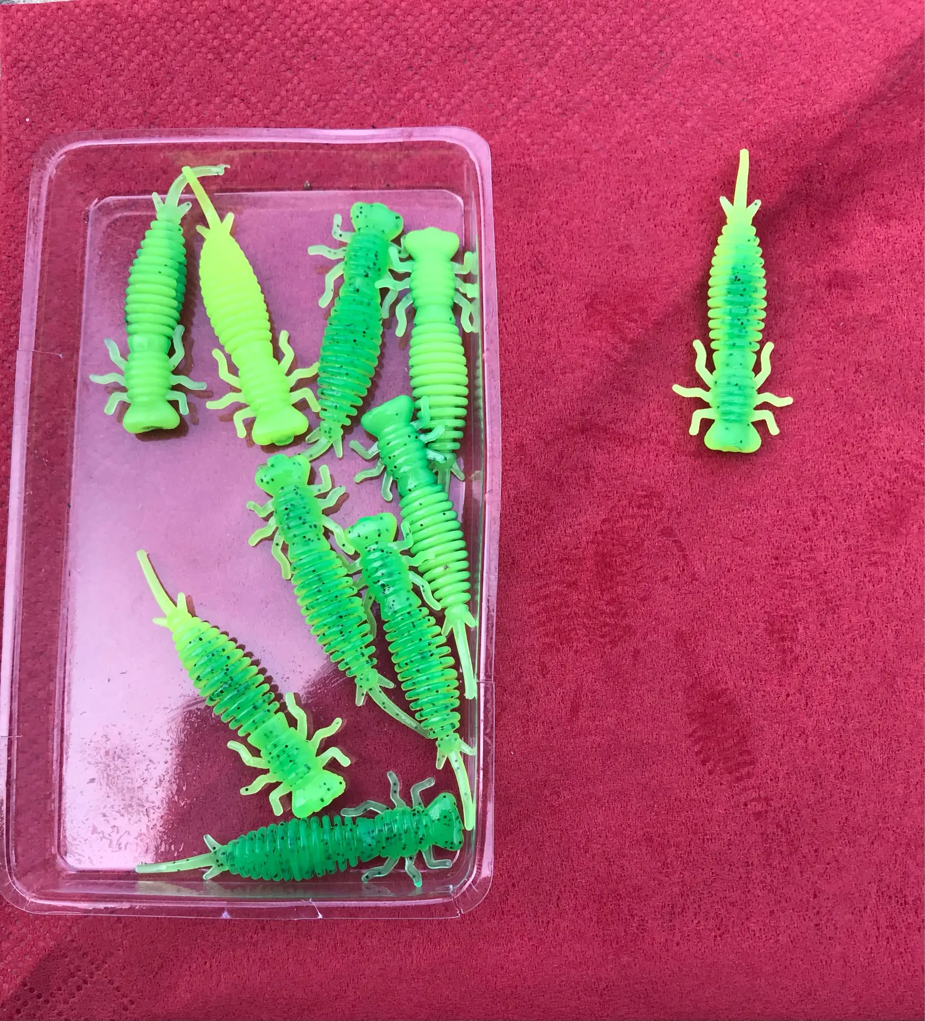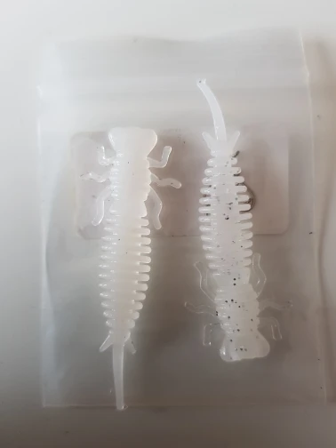Лярва отличная. Цвет удивительно красивый. Резина очень крепкая. Хорошо тянется и при этом не рвётся. Рыбный запах. Эластичность средняя. Ну я думаю что это дело поправимое - 2минуты проварить и будет лучше изгибаться. Продавцу 5***** за красивые цвета.