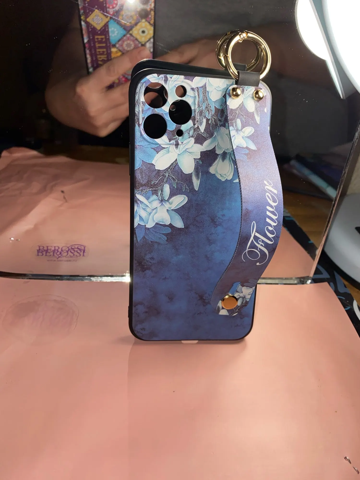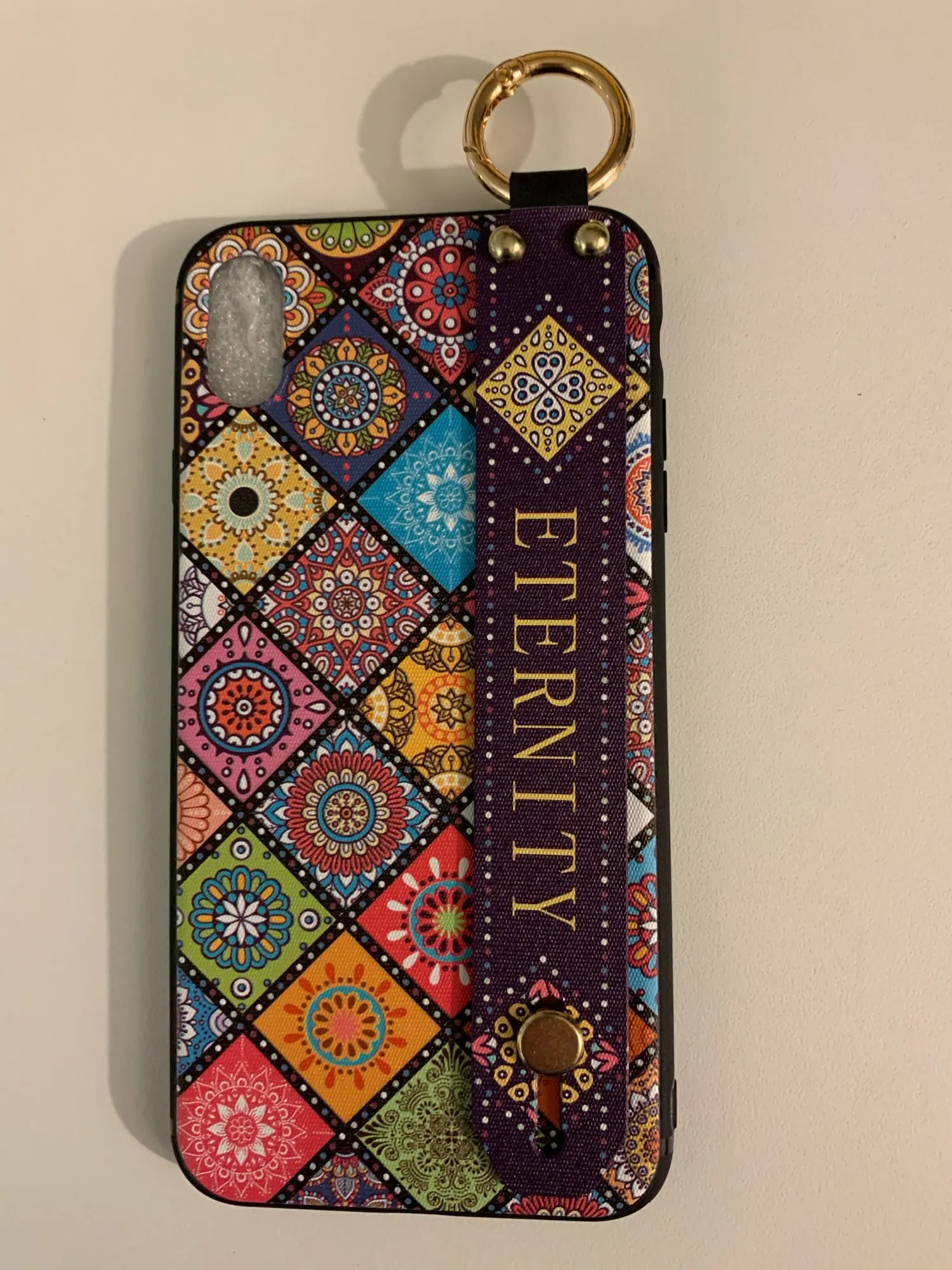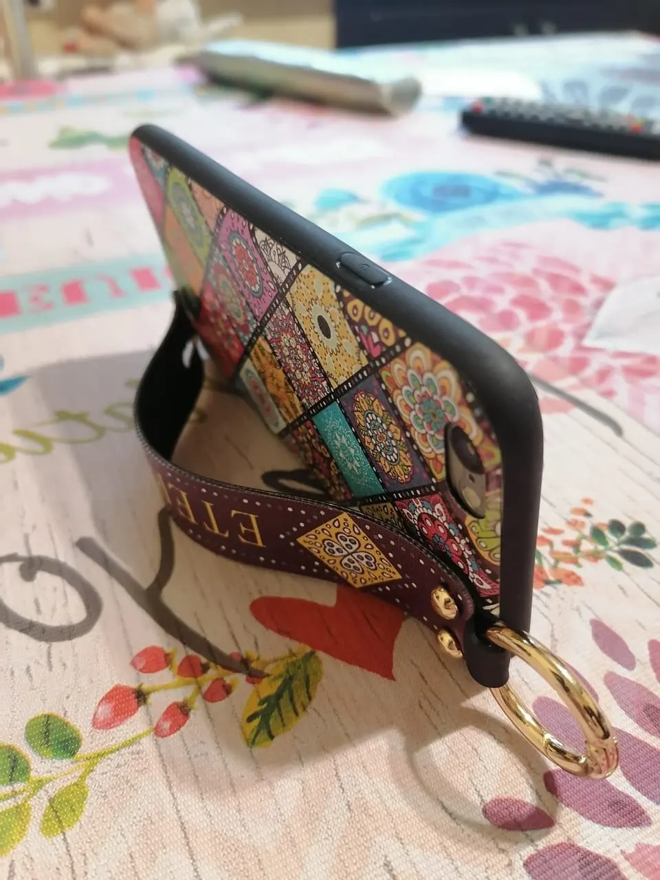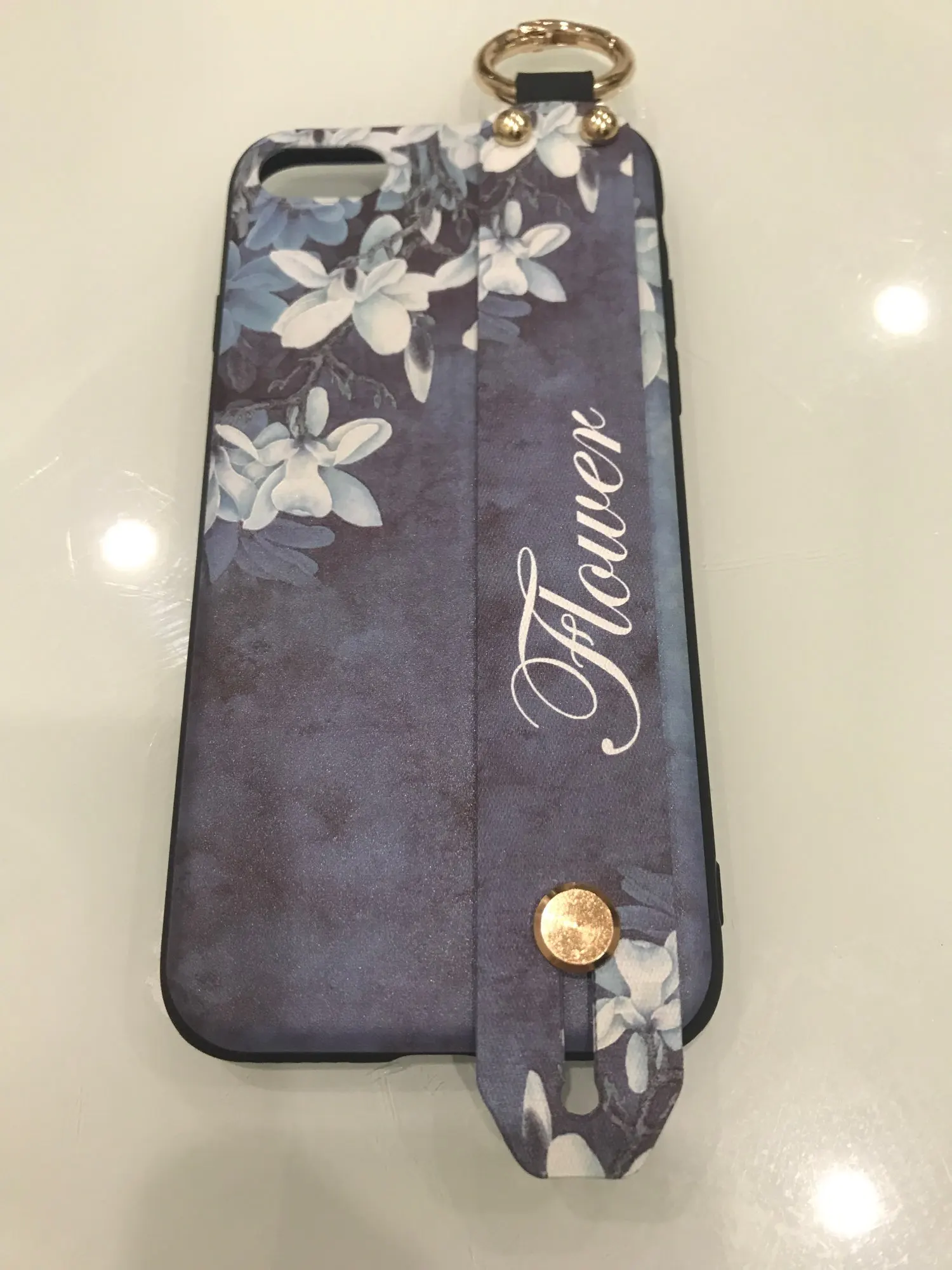 Красивый чехол, сидит отлично, рисунок сделан качественно. Ручка плотная, крепление кольца крепкое. Единственное когда кладёшь на стол или на другую твёрдую поверхность, телефон скользит так как опора встаёт на три железные кнопки на чехле. На функционал данная особенность не влияет.