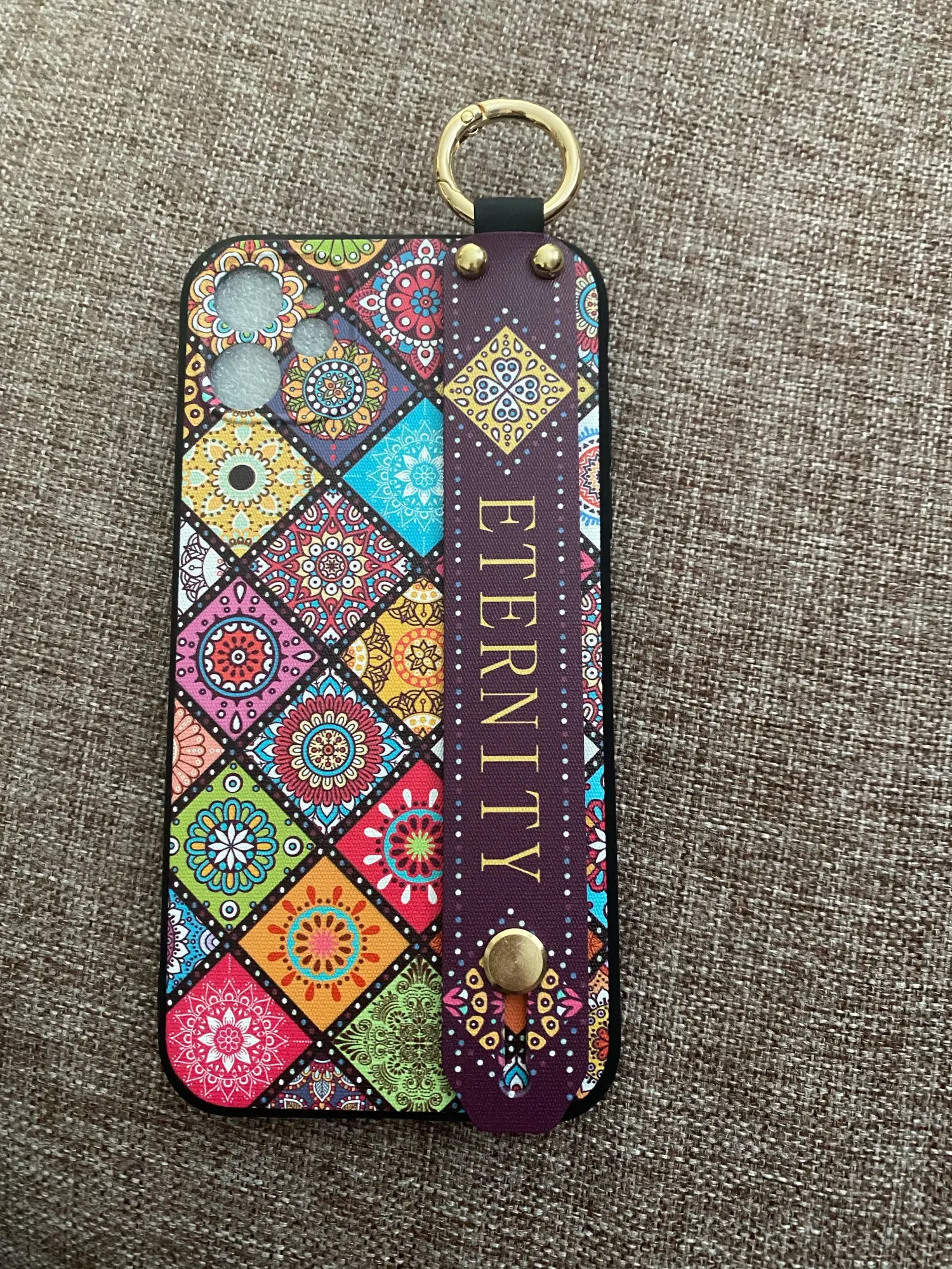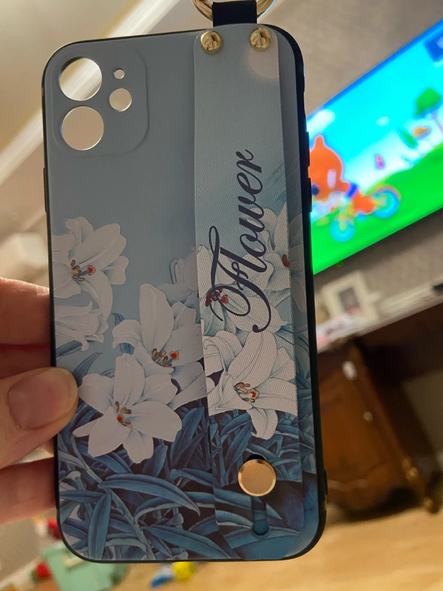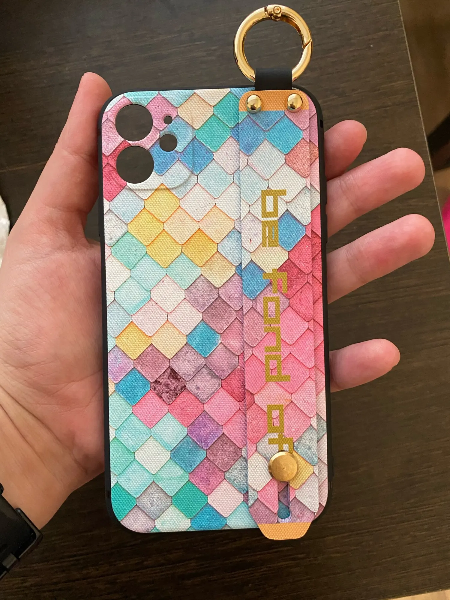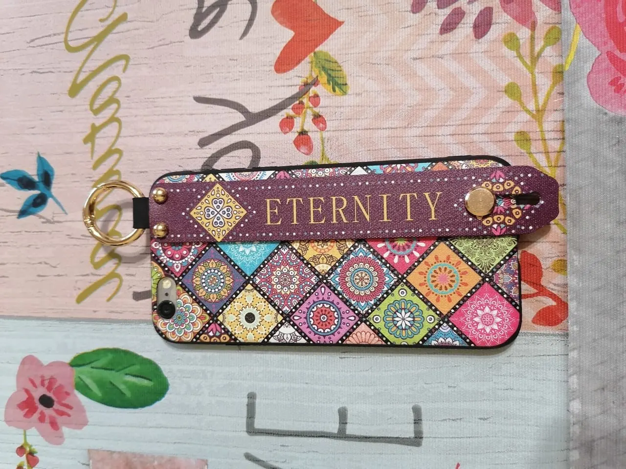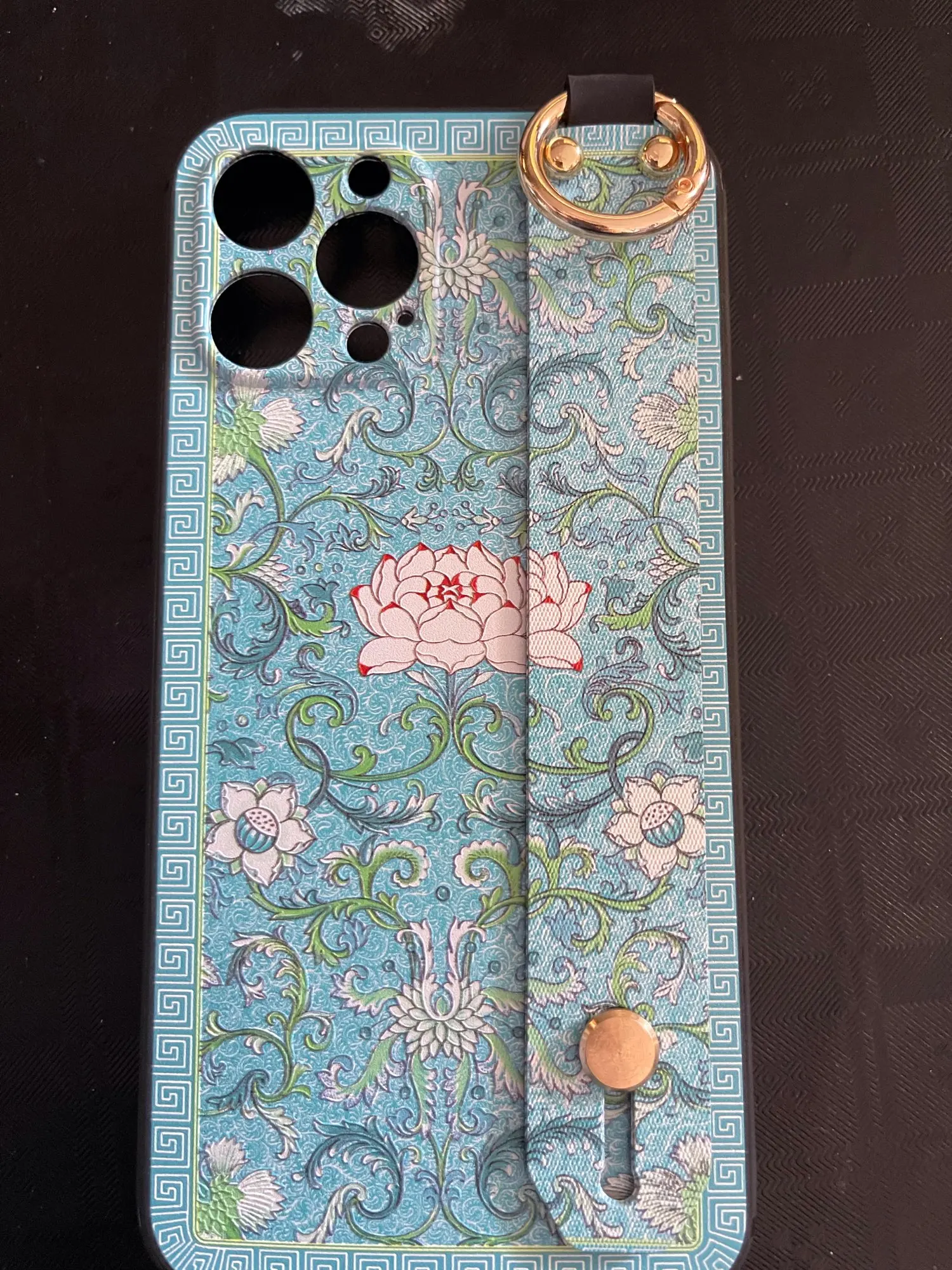 Красивый чехол, сидит отлично, рисунок сделан качественно. Ручка плотная, крепление кольца крепкое. Единственное когда кладёшь на стол или на другую твёрдую поверхность, телефон скользит так как опора встаёт на три железные кнопки на чехле. На функционал данная особенность не влияет.