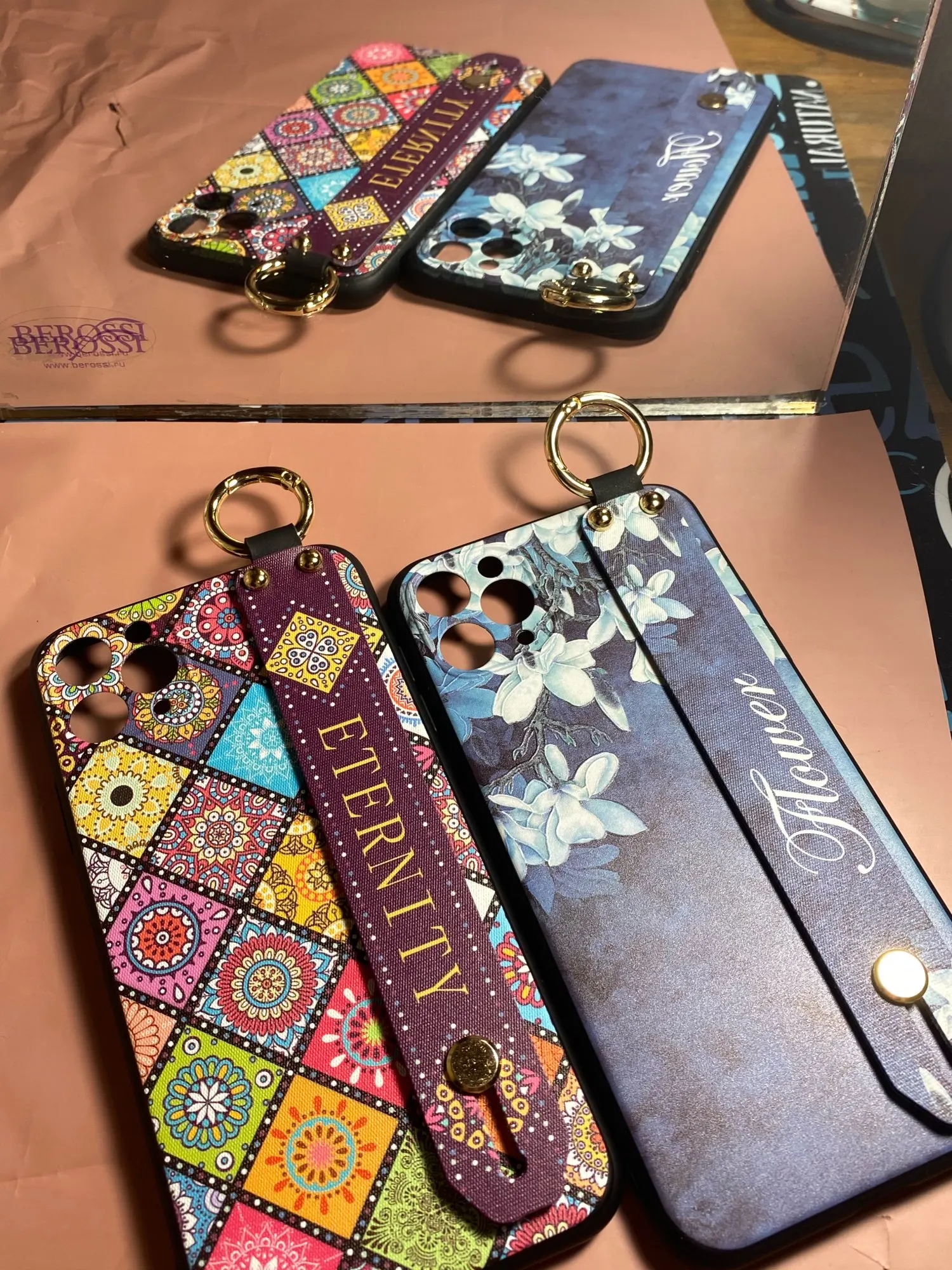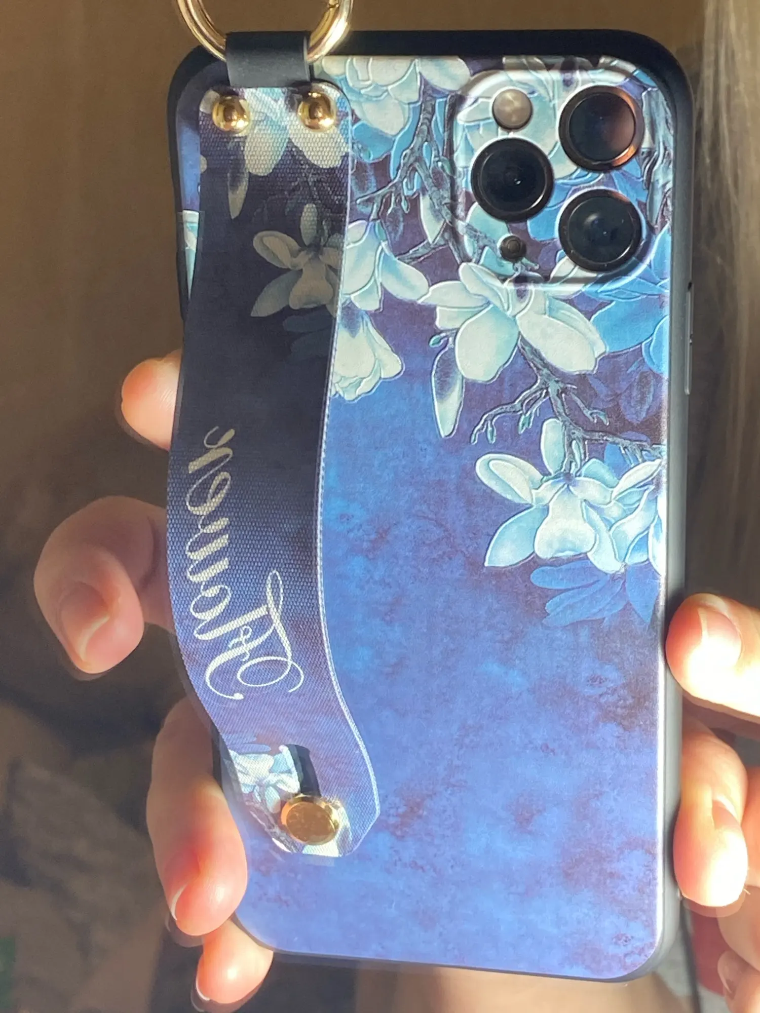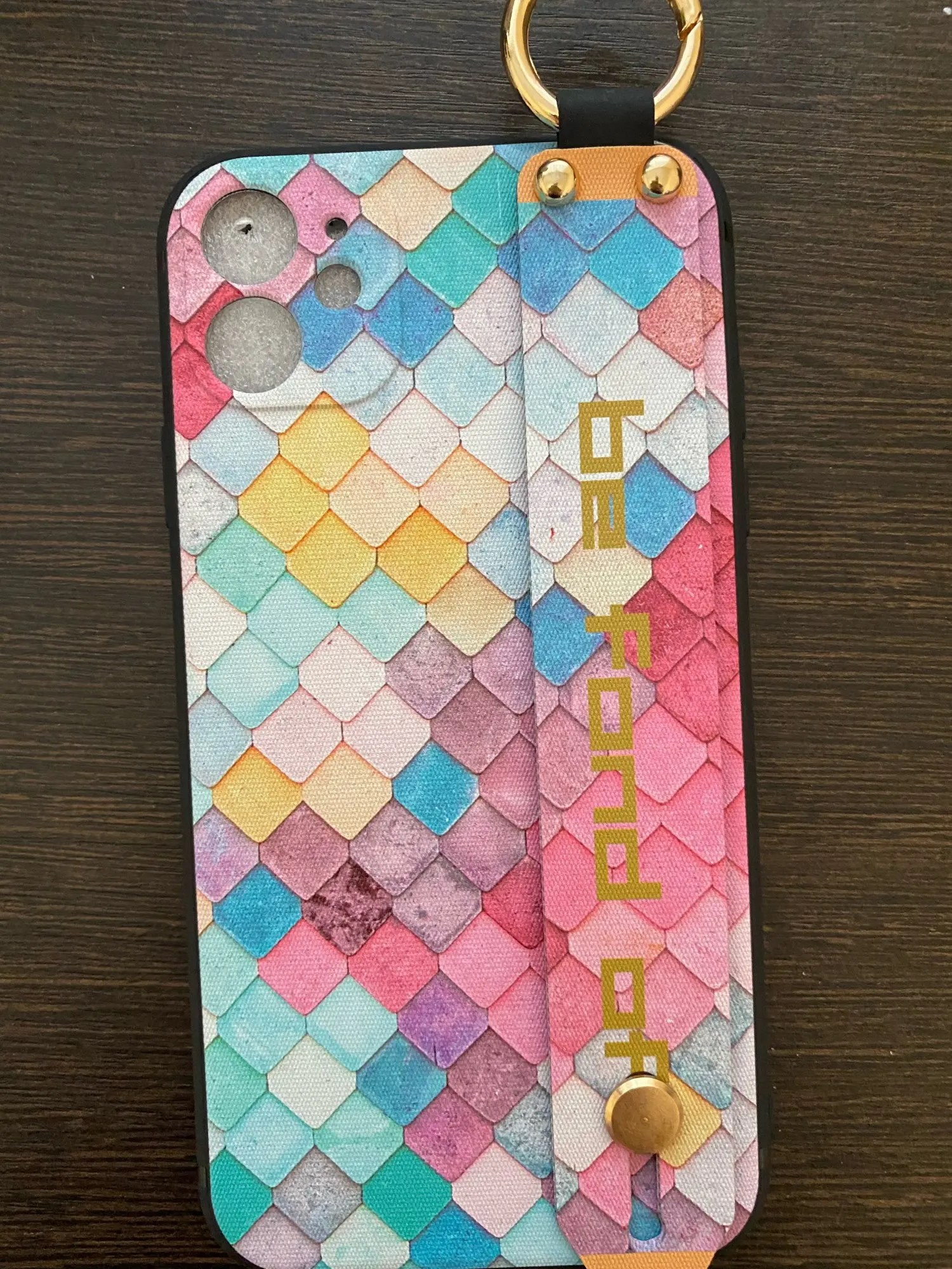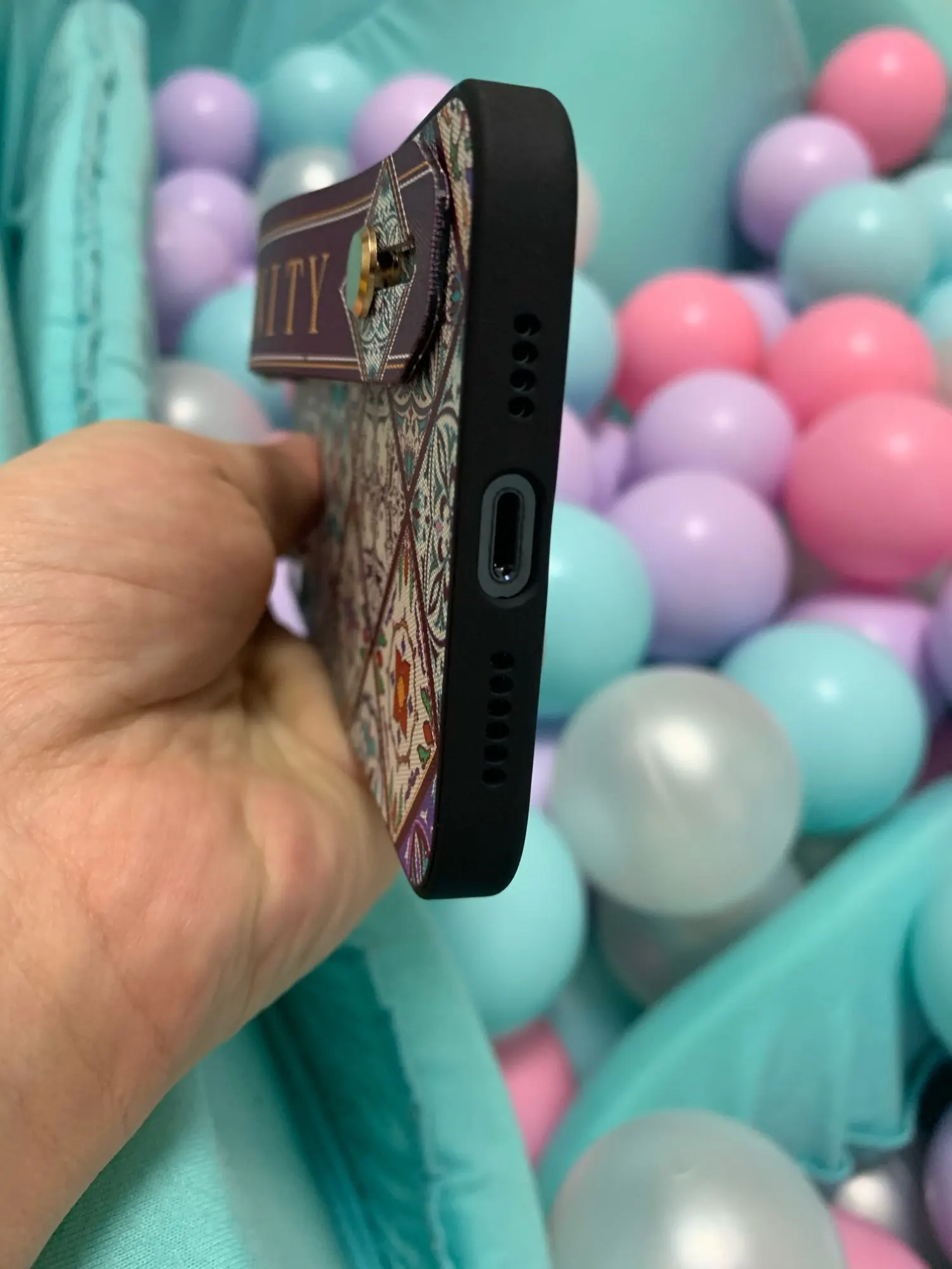 Красивый чехол, сидит отлично, рисунок сделан качественно. Ручка плотная, крепление кольца крепкое. Единственное когда кладёшь на стол или на другую твёрдую поверхность, телефон скользит так как опора встаёт на три железные кнопки на чехле. На функционал данная особенность не влияет.