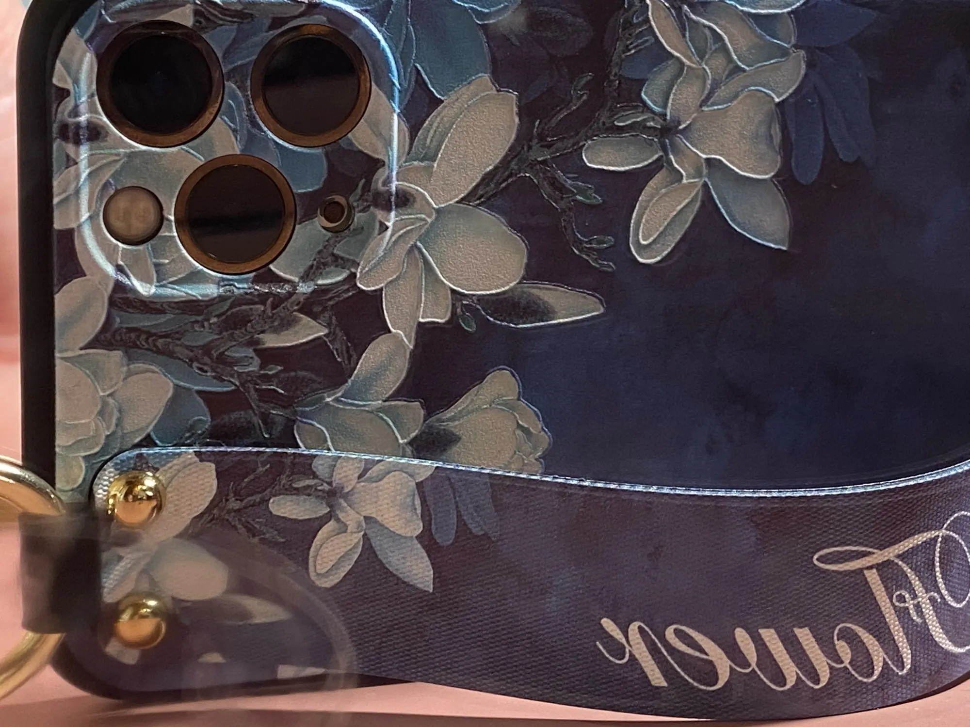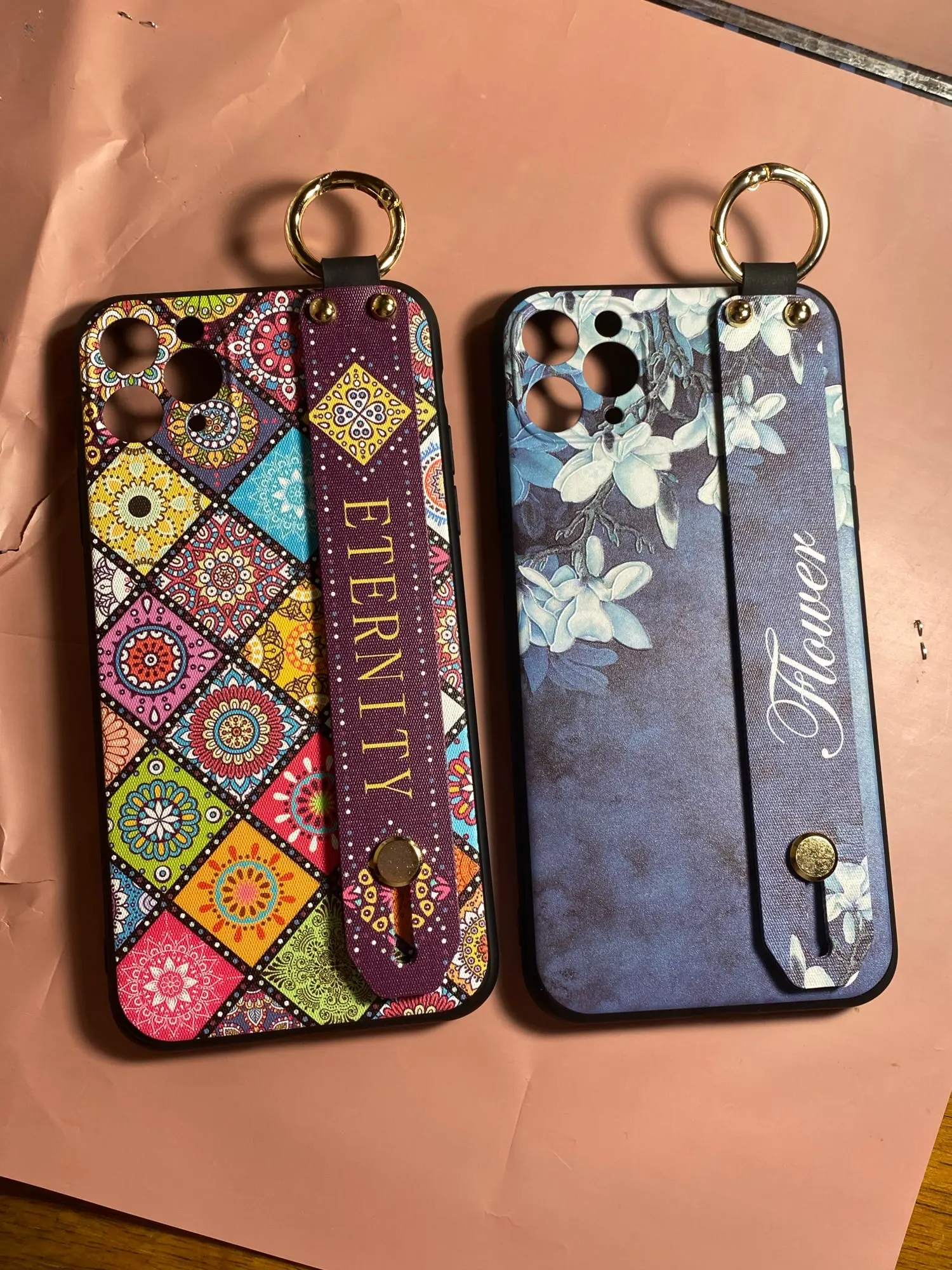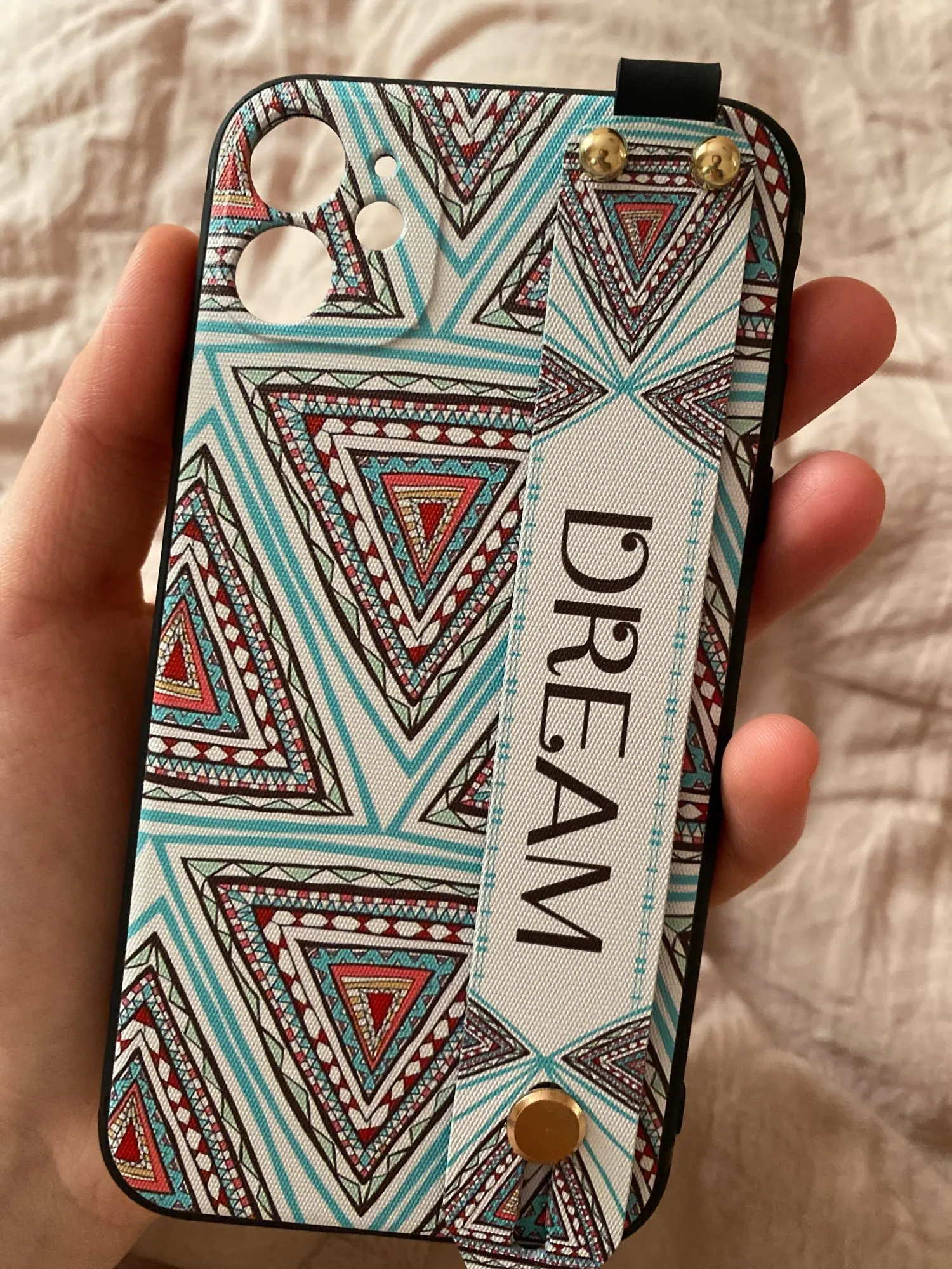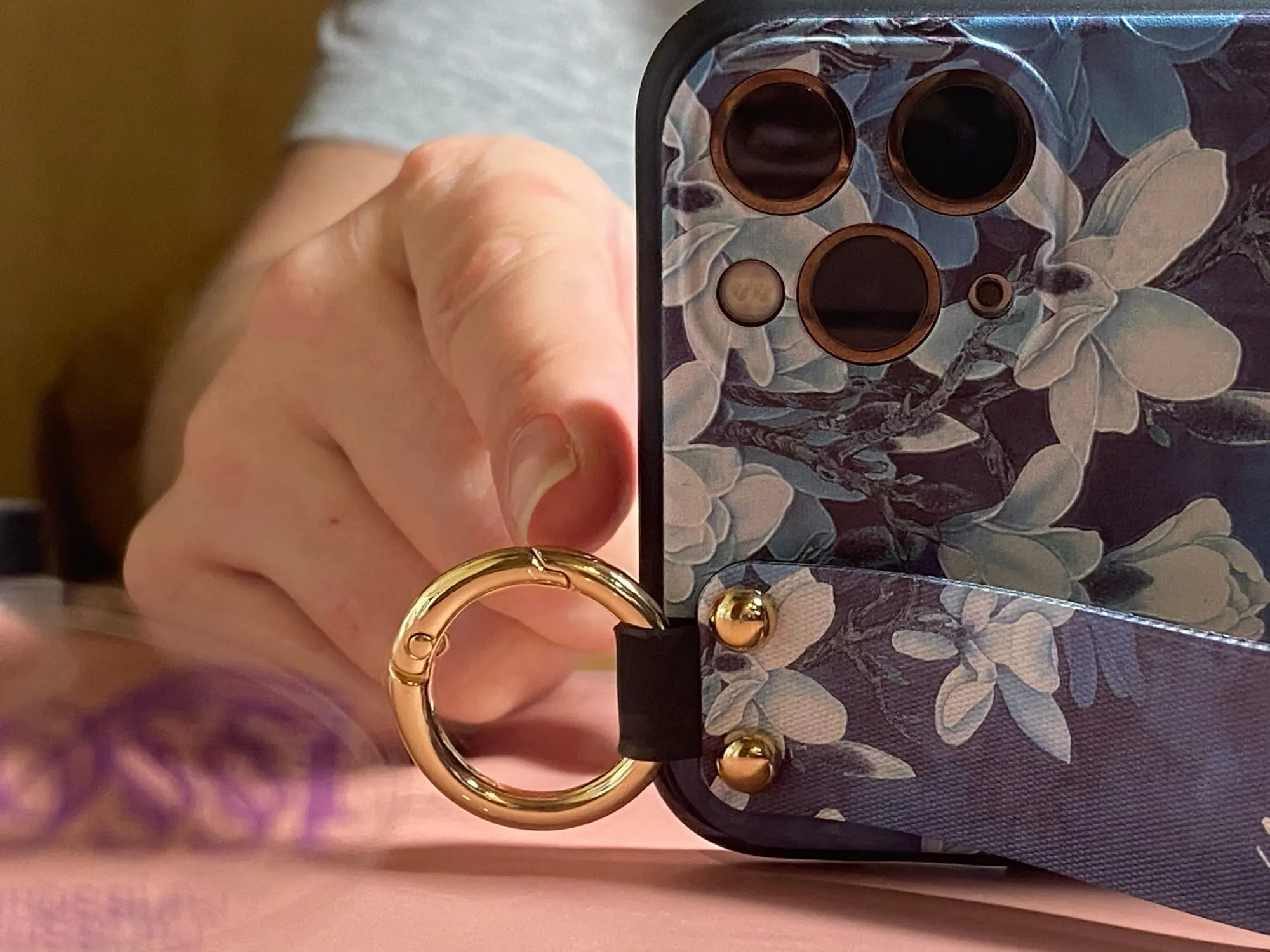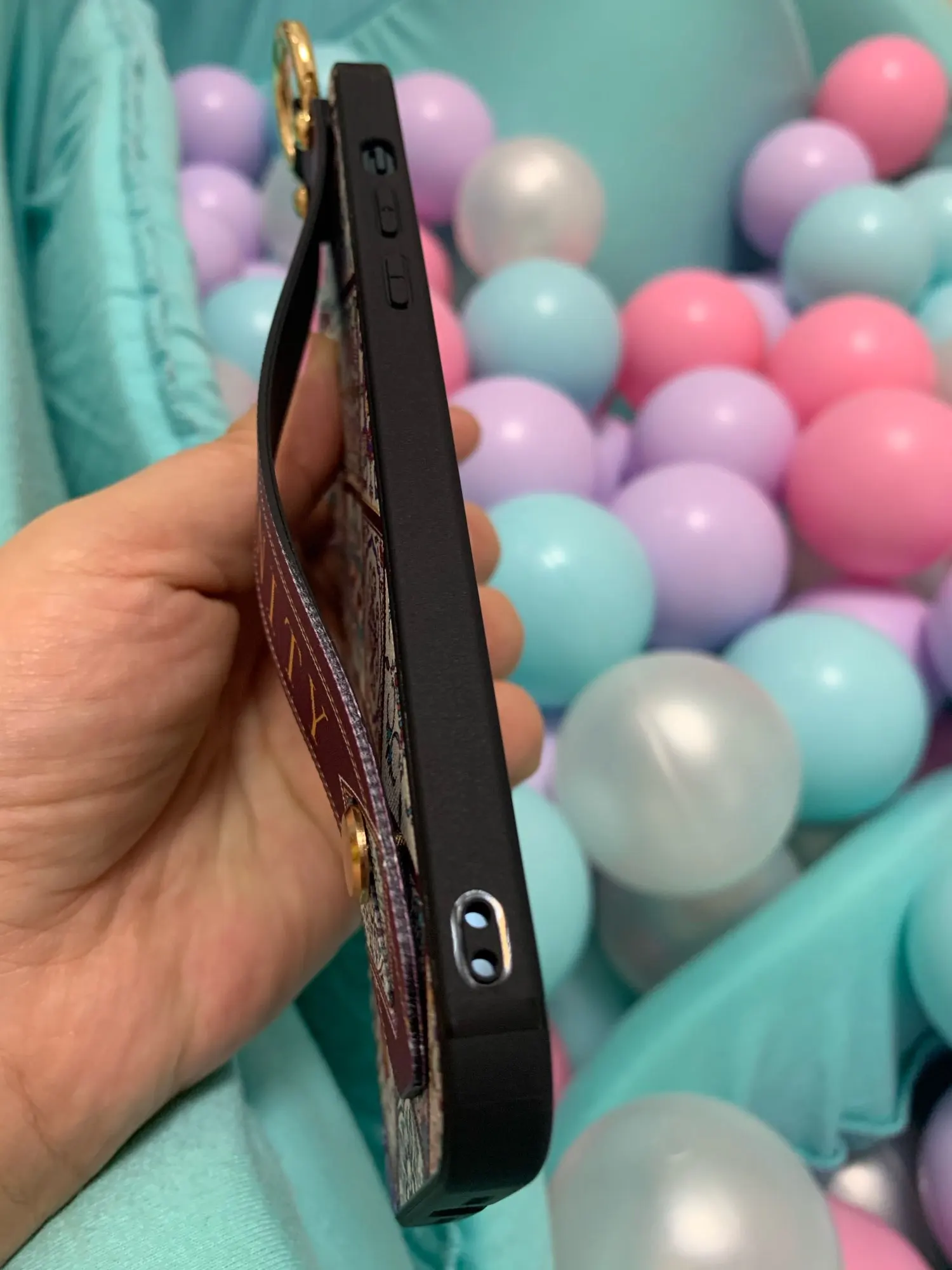 Красивый чехол, сидит отлично, рисунок сделан качественно. Ручка плотная, крепление кольца крепкое. Единственное когда кладёшь на стол или на другую твёрдую поверхность, телефон скользит так как опора встаёт на три железные кнопки на чехле. На функционал данная особенность не влияет.