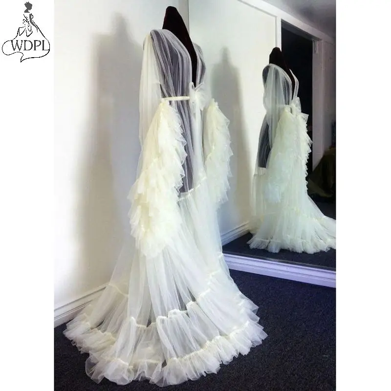 Многослойный тюлевый халат кремового цвета, с длинным рукавом, со шлейфом, прозрачные оборки, для фотосъемки беременных женщин
