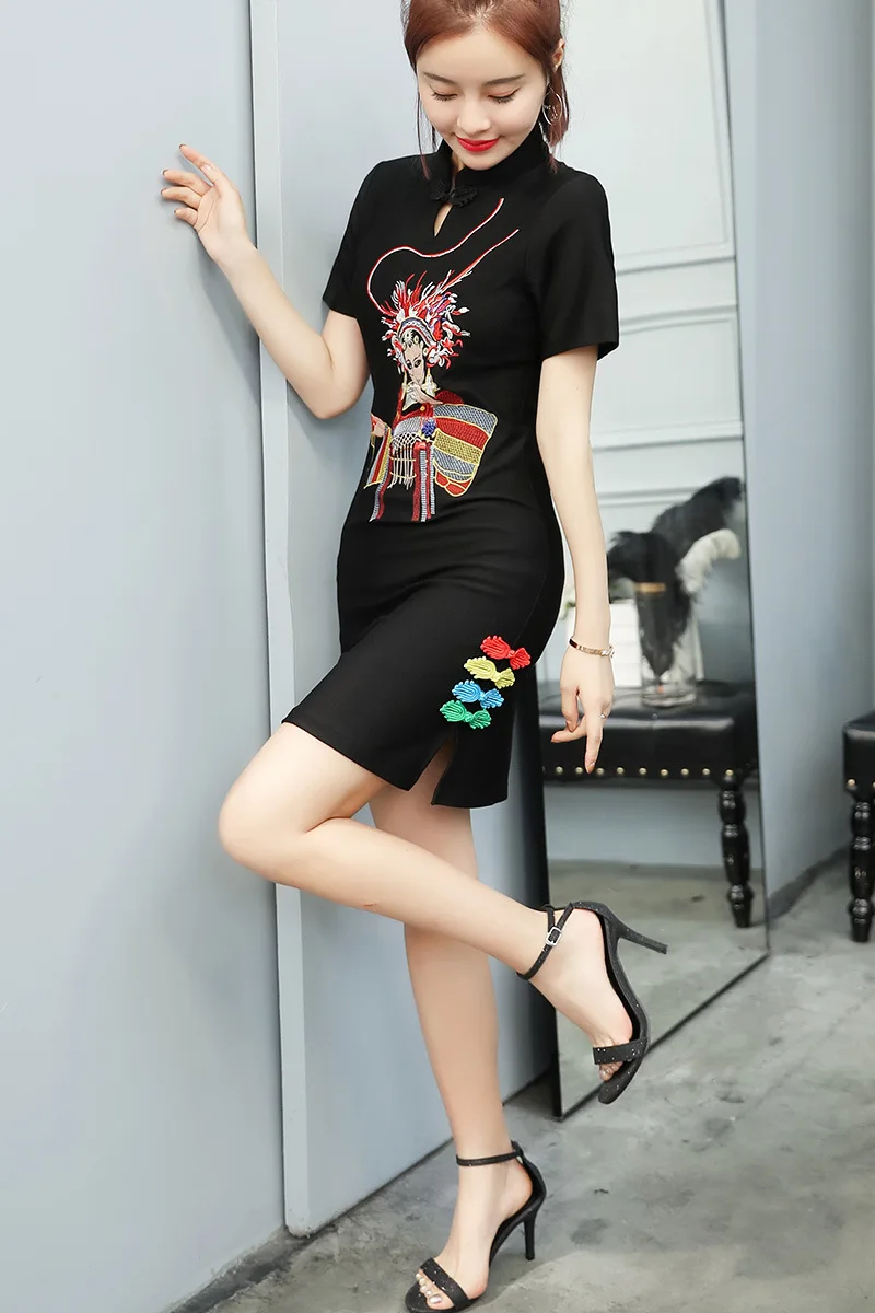 Женское платье с воротником-стойкой и пуговицами ручной работы, красное китайское Ципао с принтом, Чонсам с высоким разрезом