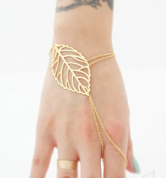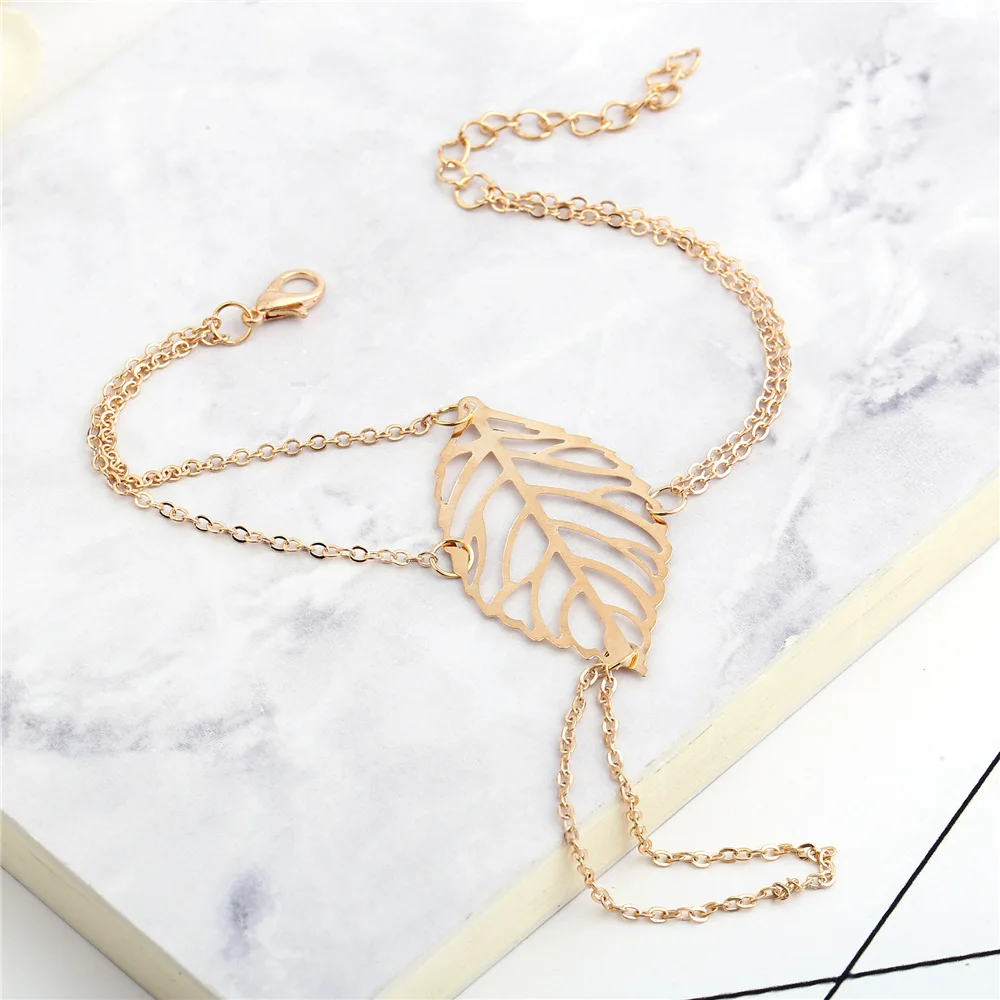 Женский браслет с полыми листьями, браслет золотистого цвета с цепочкой-подвеской на запястье