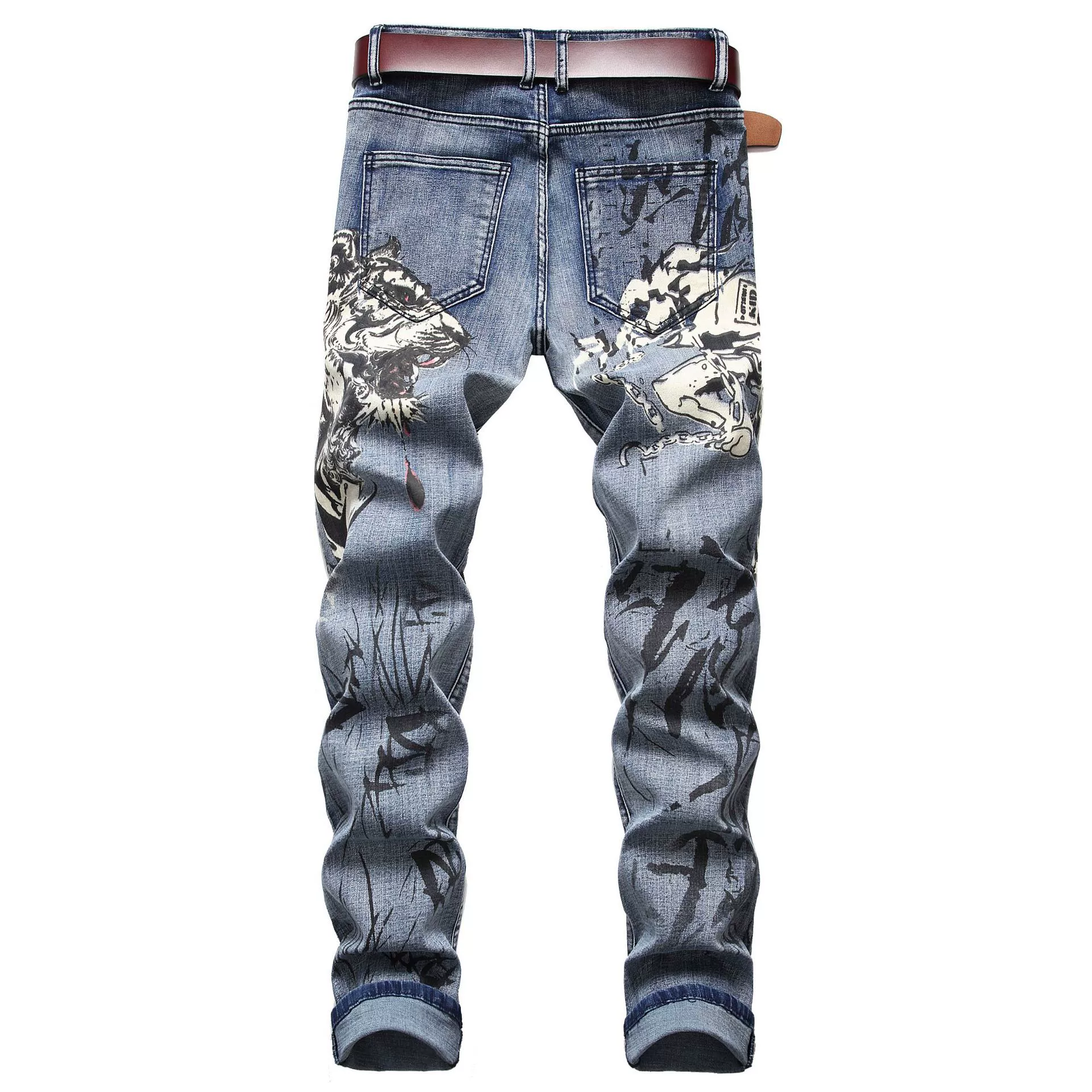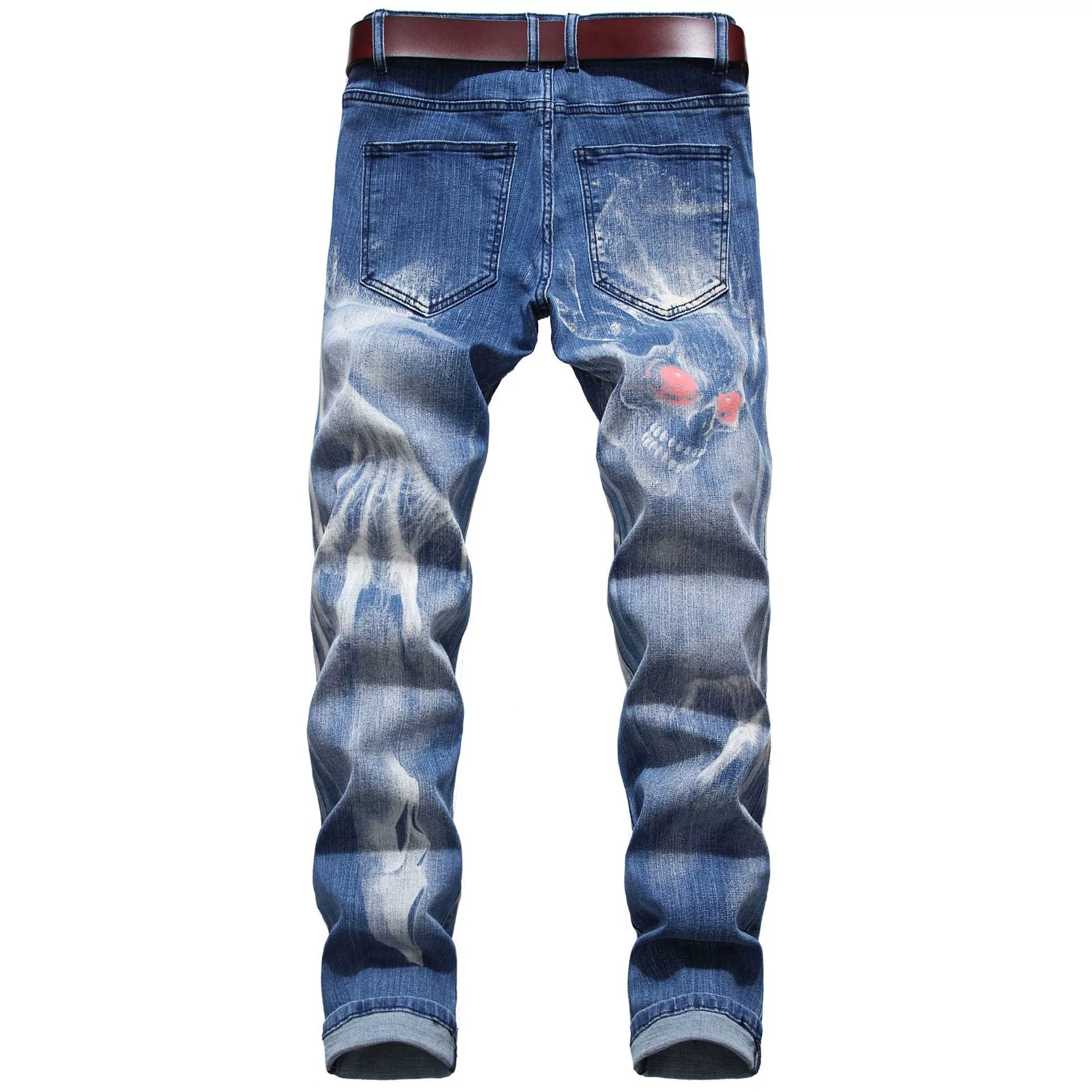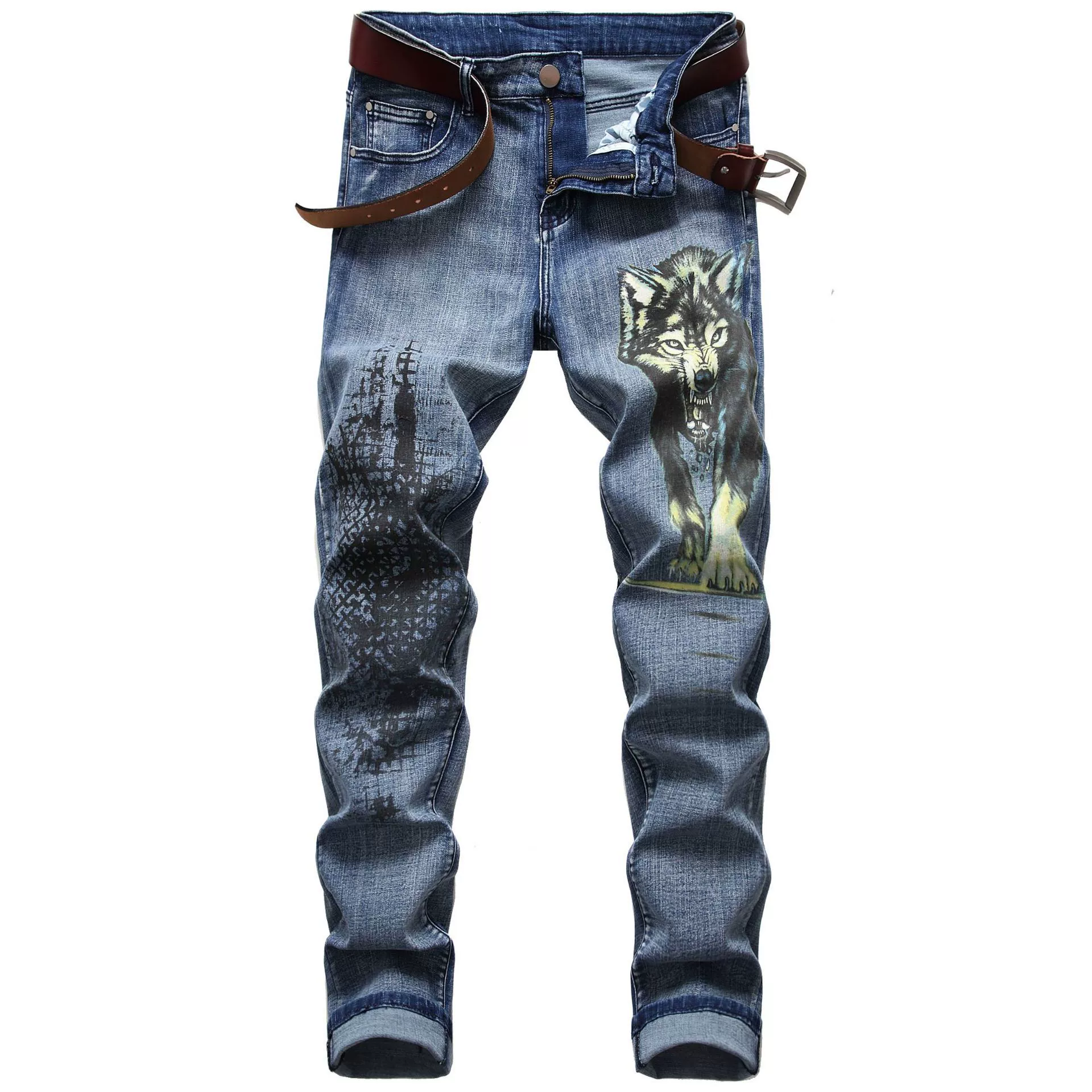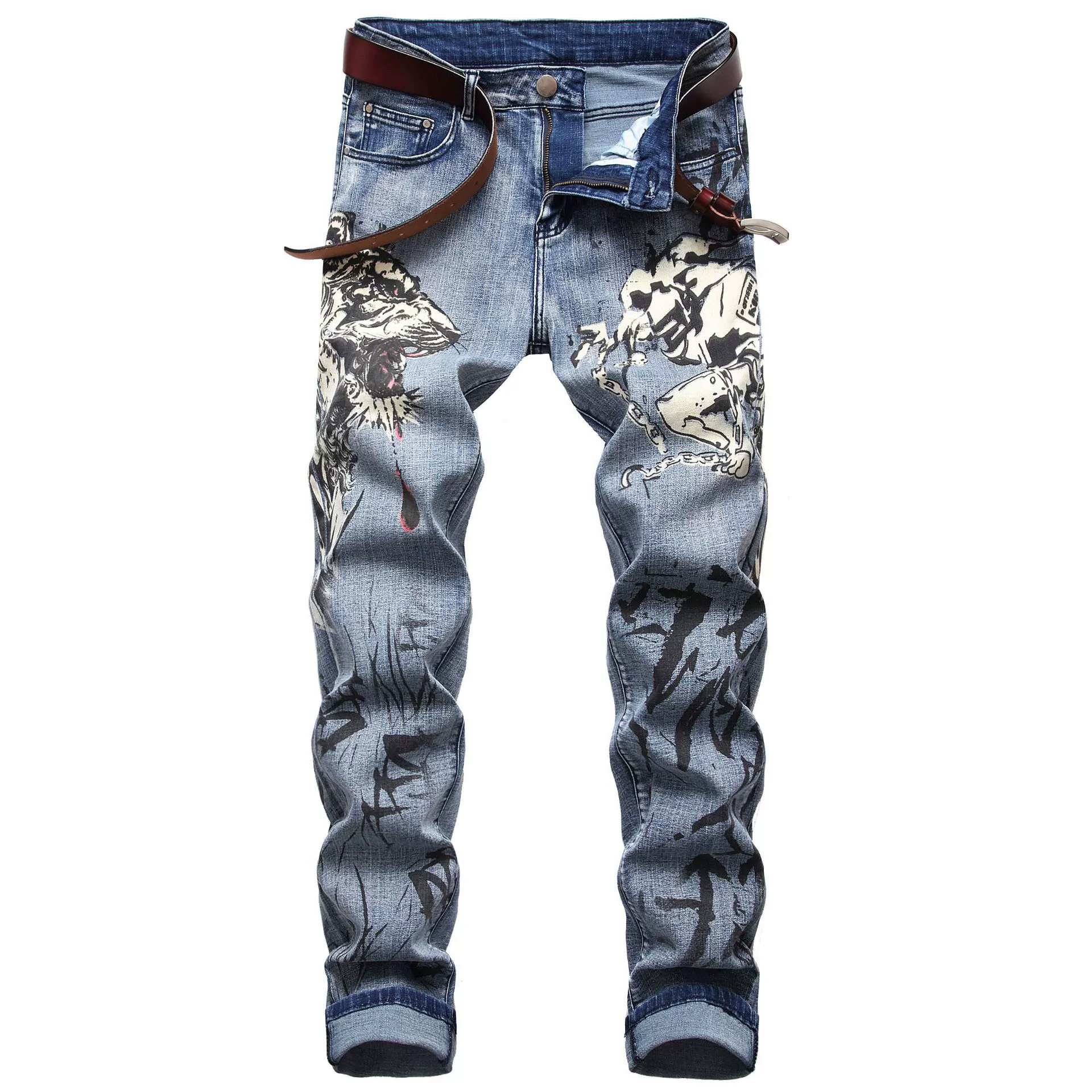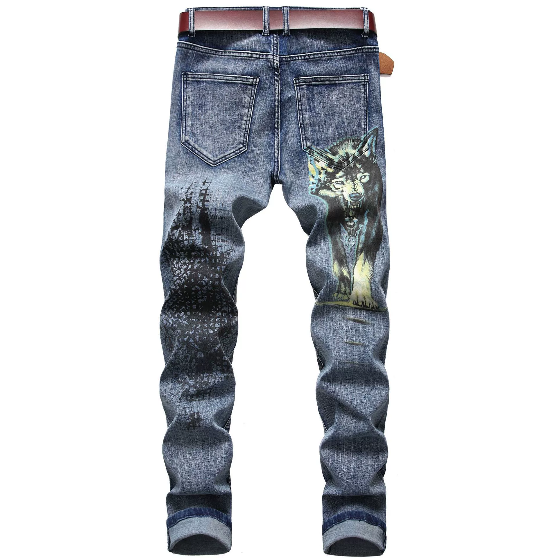 Модные мужские джинсовые брюки с 3D-принтом черепа волка, Длинные Классические облегающие джинсовые брюки, Мужская Уличная одежда, мужские эластичные джинсы
