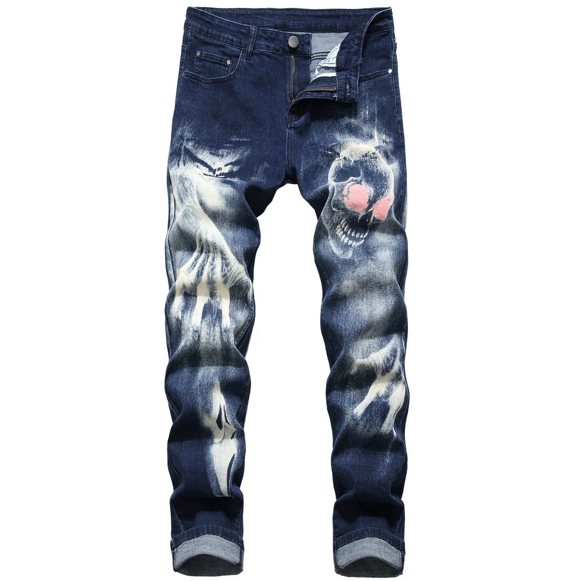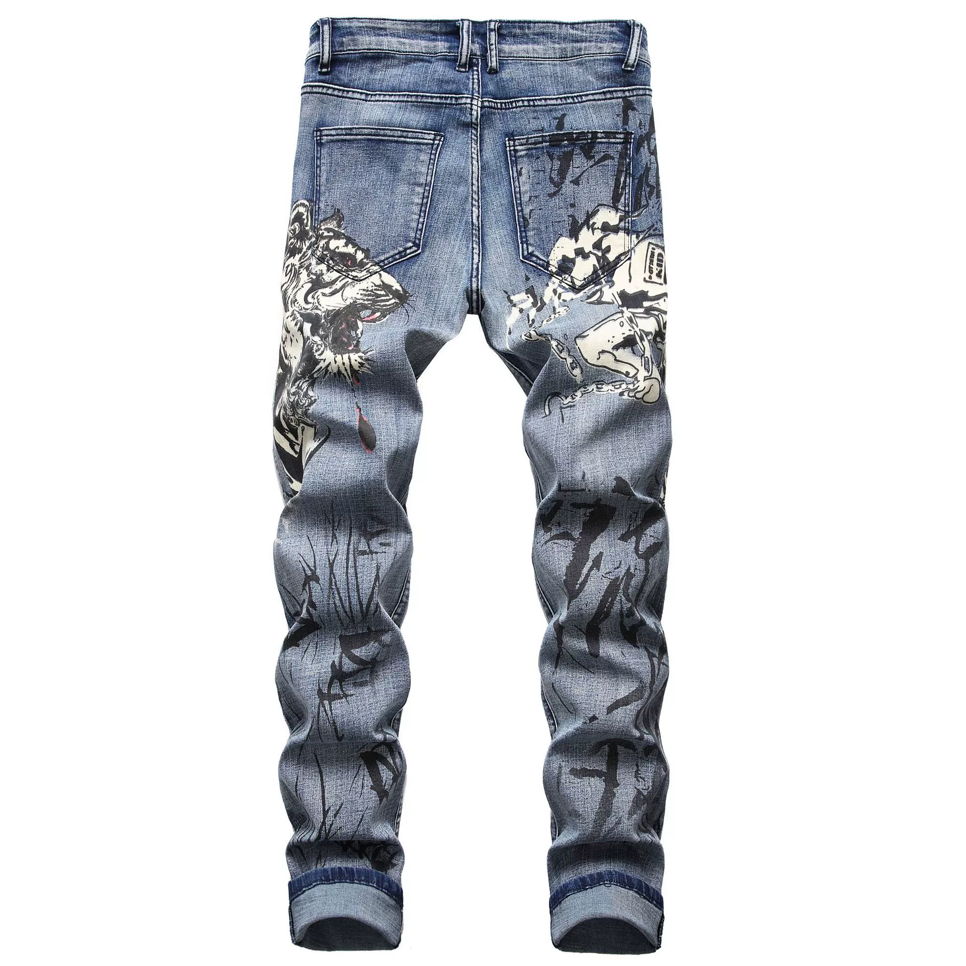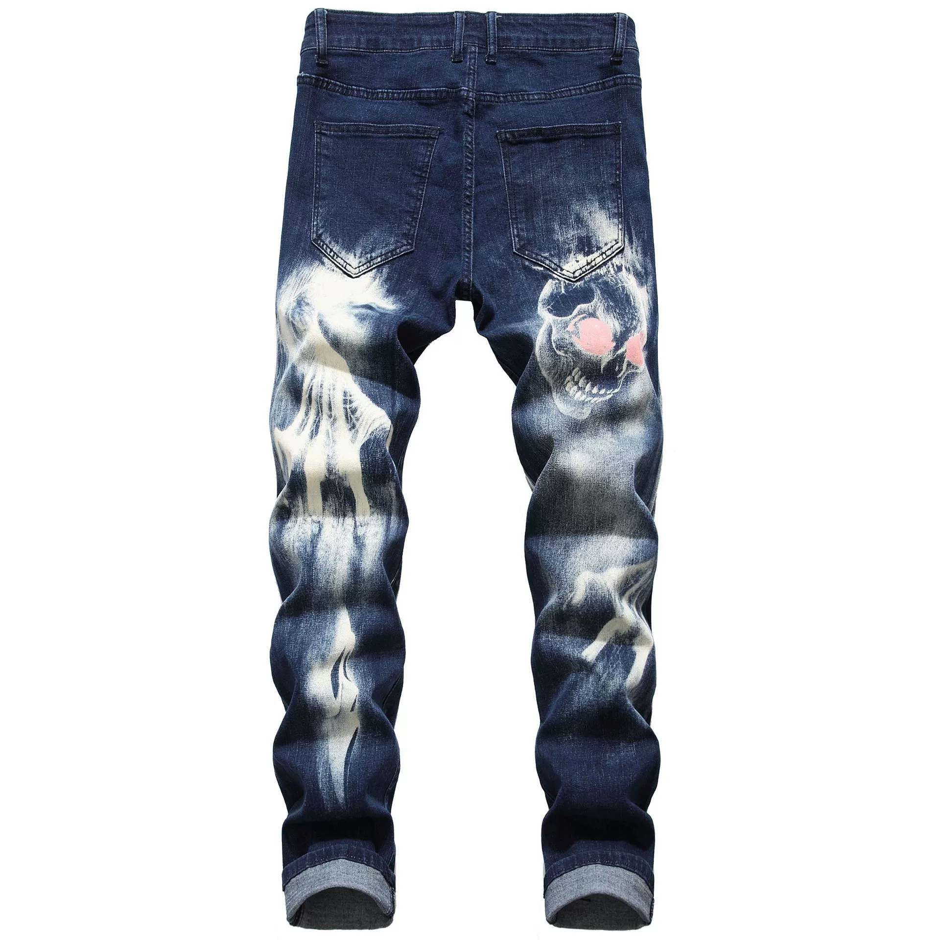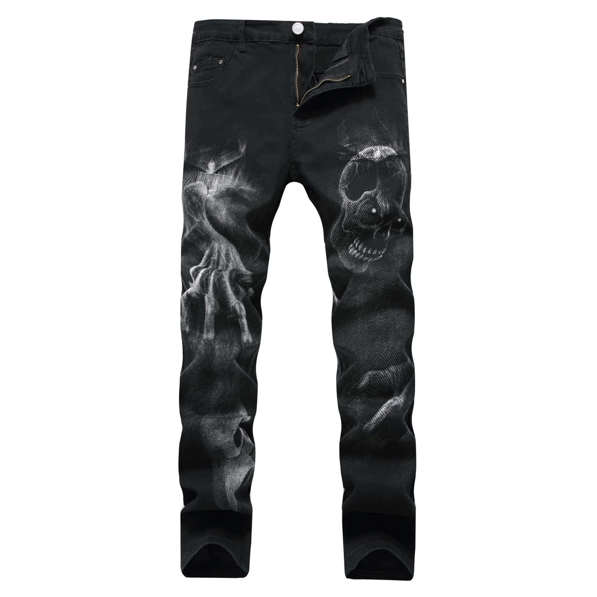 Модные мужские джинсовые брюки с 3D-принтом черепа волка, Длинные Классические облегающие джинсовые брюки, Мужская Уличная одежда, мужские эластичные джинсы