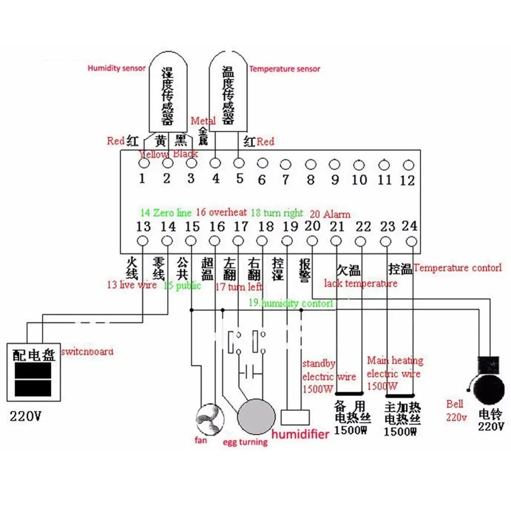 6. Максимальный выходной ток нагрузки: контроль температуры, недостаточная температура 8.A/ AC220V, перегрев, поворот яйца влево, поворот яйца вправо, контроль влажности, будильник 1A/AC220V