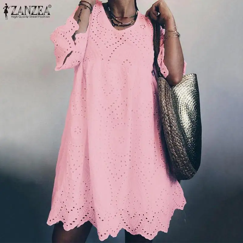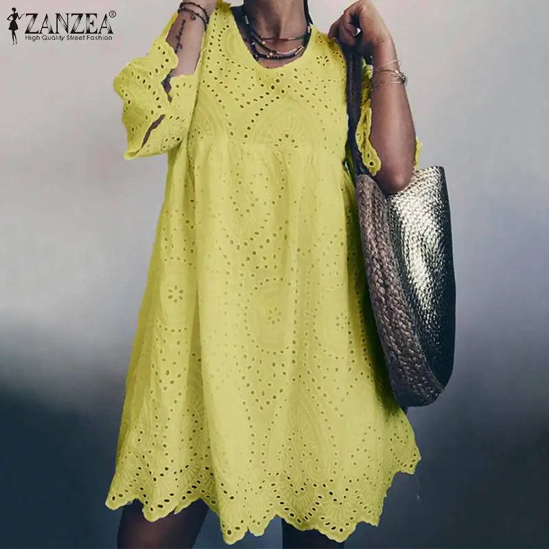 Женское богемное кружевное платье ZANZEA, Летний Сарафан до колен с расклешенным рукавом, платья, хлопковый ажурный халат, 2021