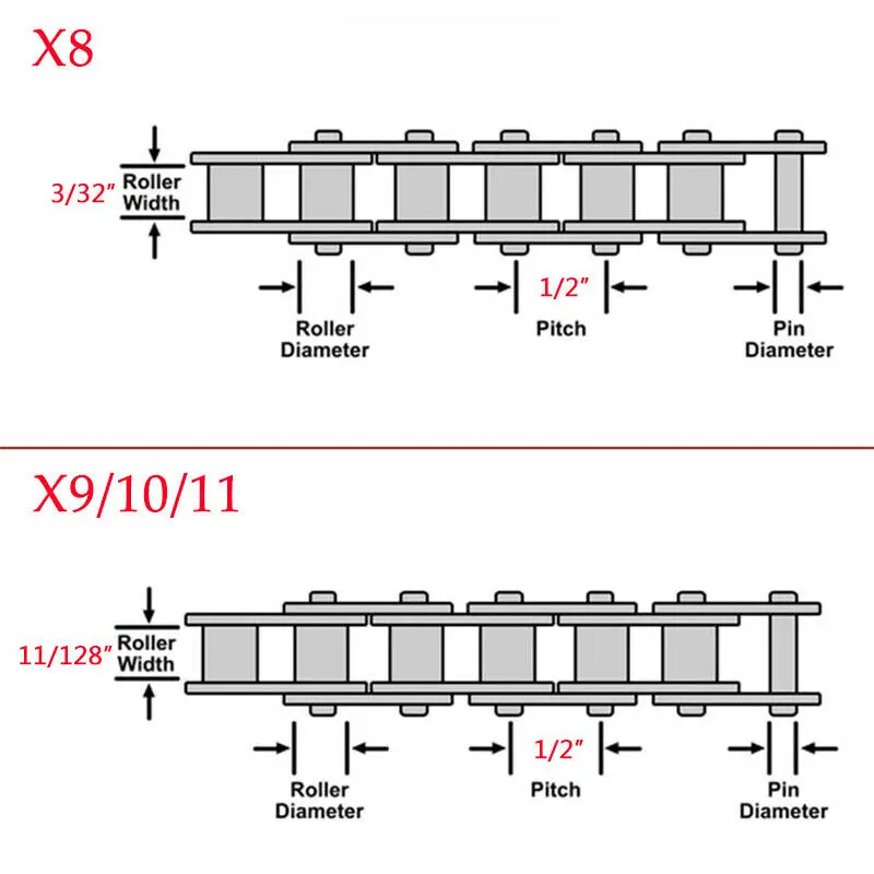 Превосходное переключение передач с двойной наружной пластиной в форме моста «X», не направленная, покрытая наполовину никелем, эластичная обработка, высокая производительность, чрезвычайно прочная.