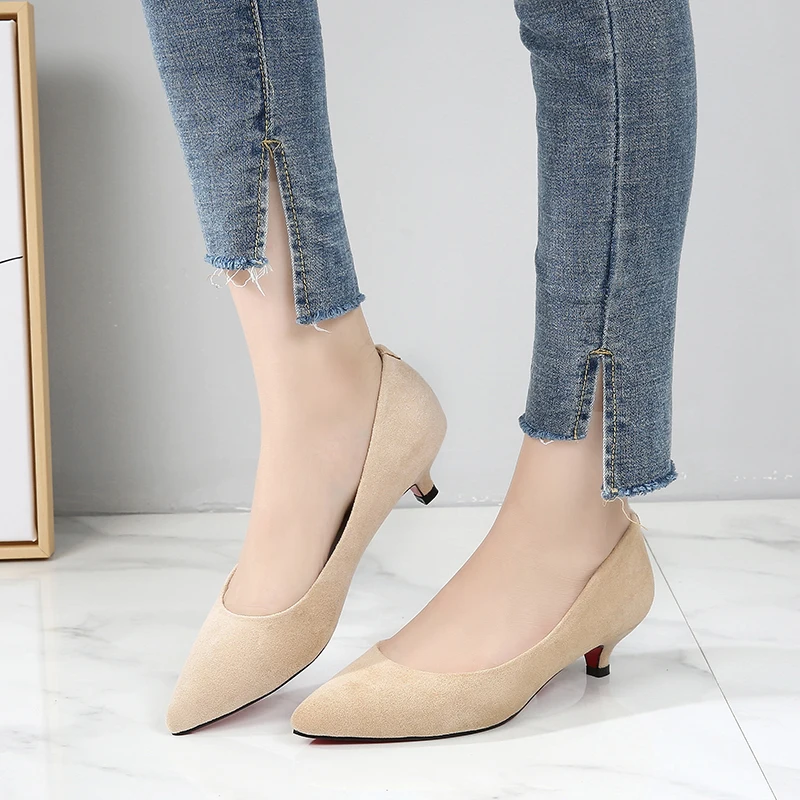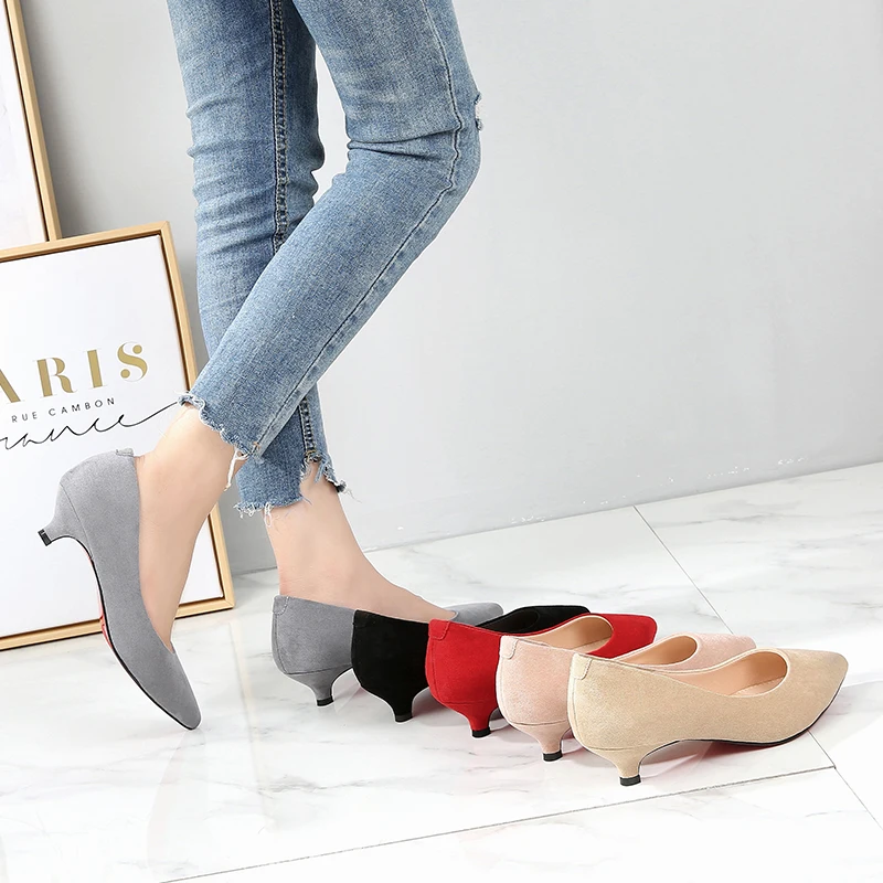 Женская обувь больших размеров 34-43 женские туфли-лодочки из флока на среднем каблуке Женская рабочая обувь на шпильках свадебные туфли с острым носком F0004
