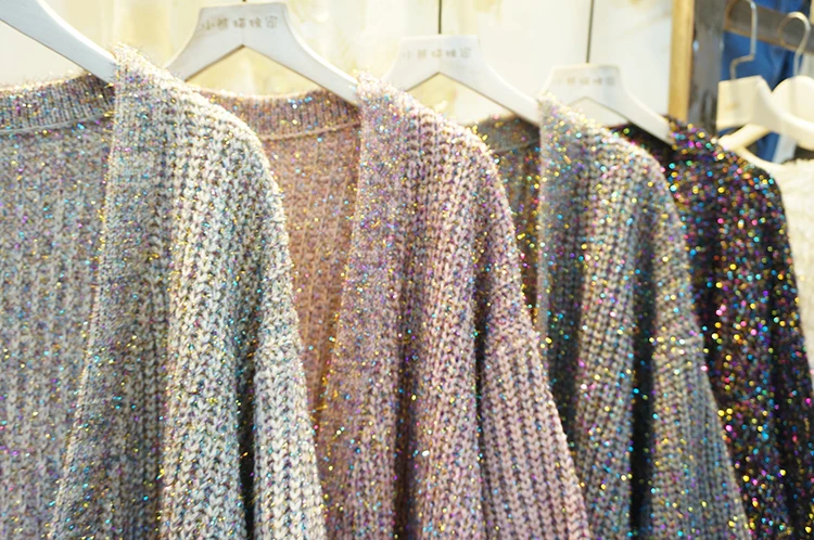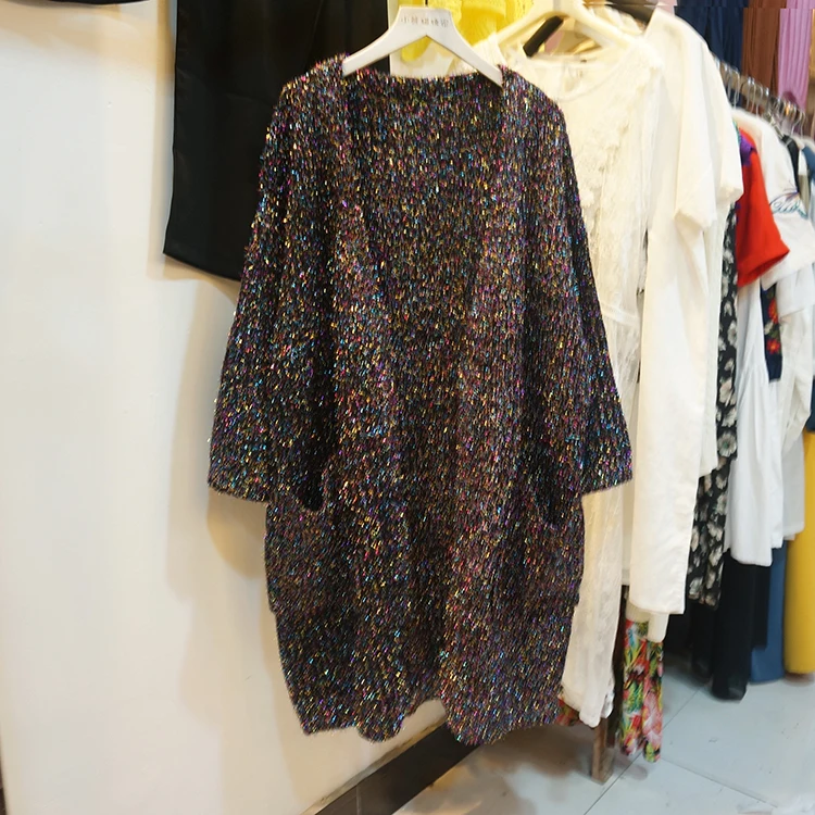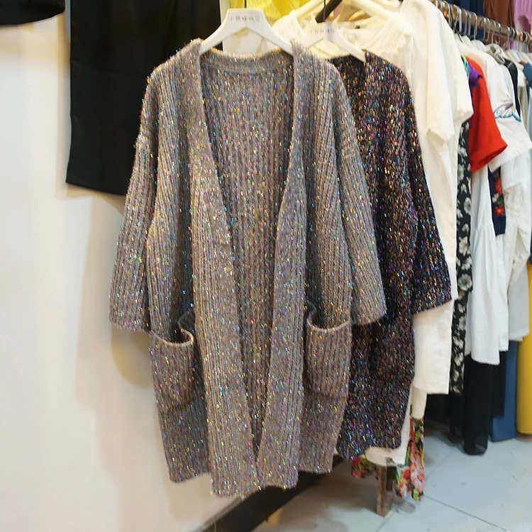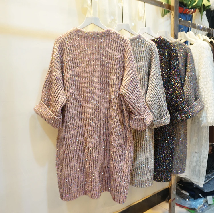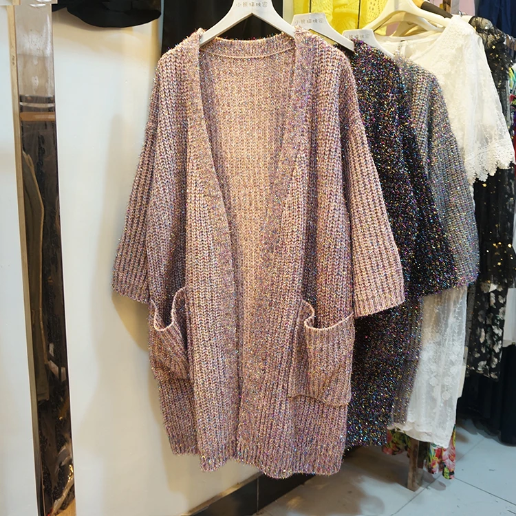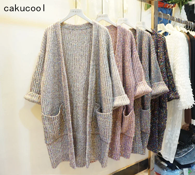 Cakucool Для женщин Серебряный люрекс Открыть стежка Bling миди длинный кардиган с карманами, свободный, корейский свитер блестящие вязаное пальто Верхняя одежда Femme для женщин; Большие размеры