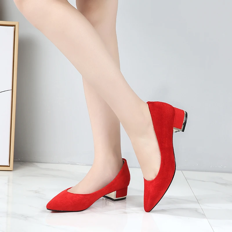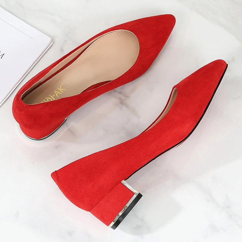 Новинка; Простые женские туфли-лодочки; Цвет красный, черный; Женские повседневные офисные туфли из флока с острым носком на среднем квадратном каблуке
