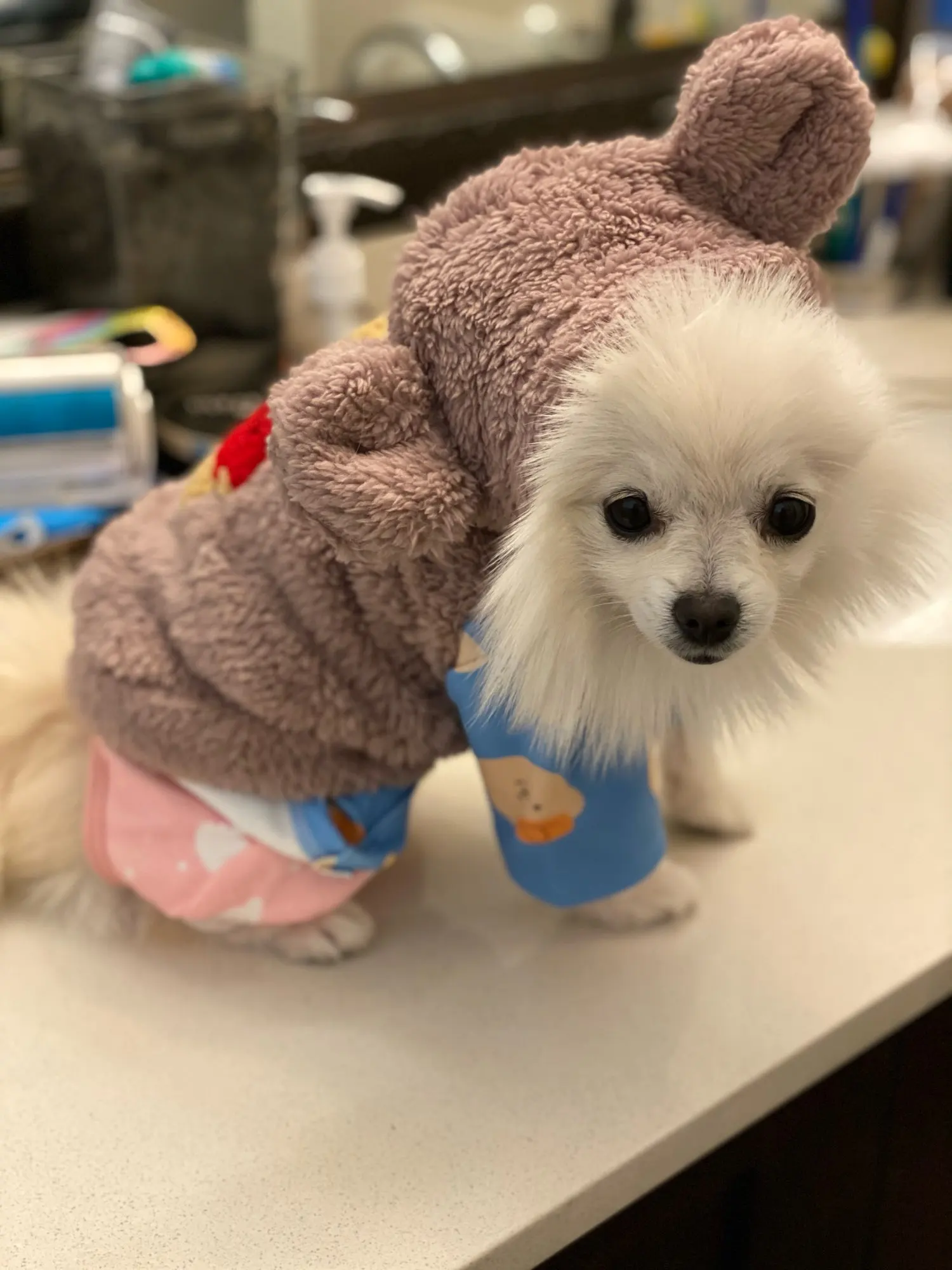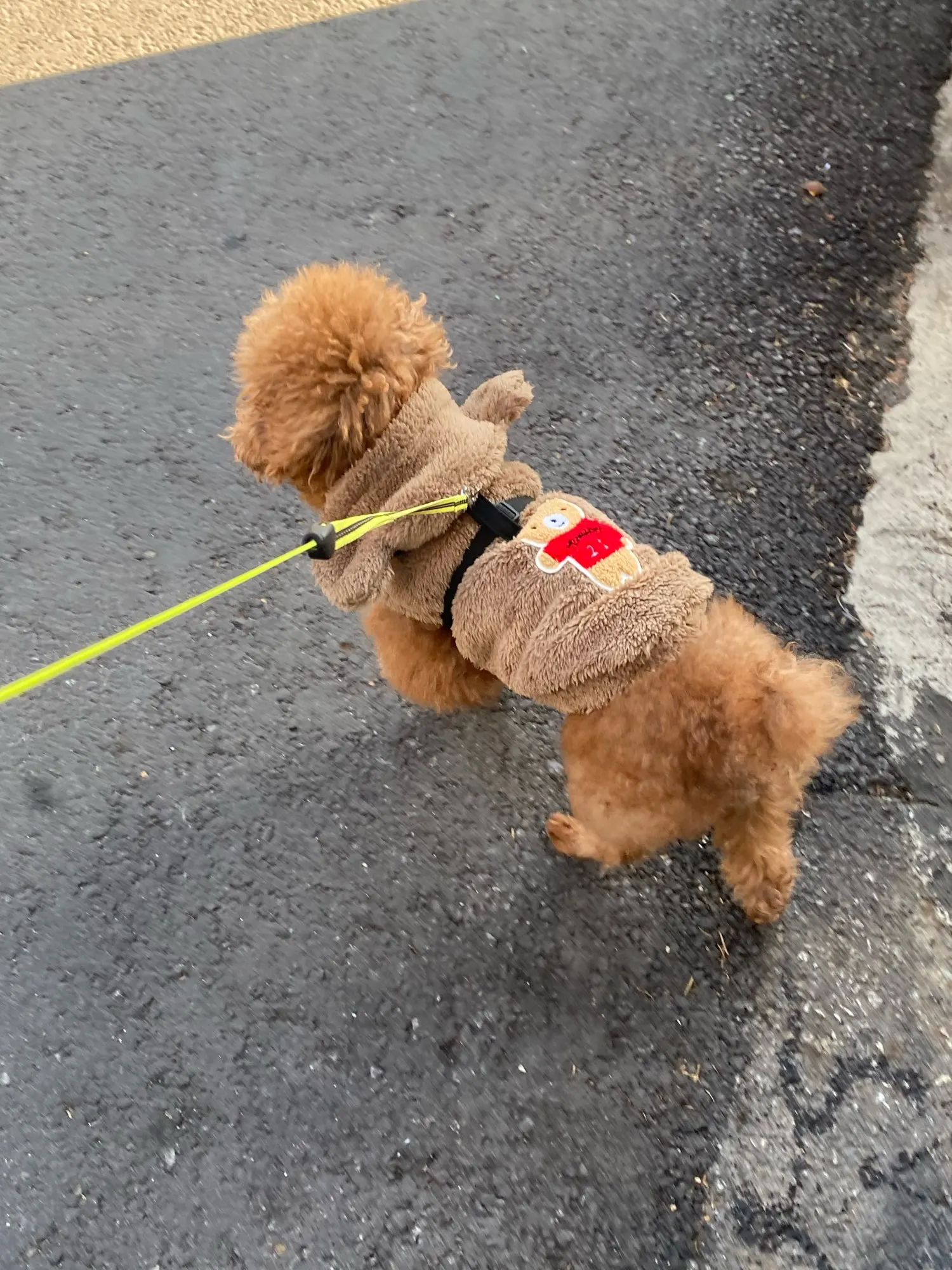 Пальто милое качество, пушистое и теплое. Это довольно эластичный материал, поэтому мы могли бы заказать размер до XL, однако приятно иметь немного места для перемещения собаки. Мне нравится! И она просто выглядит в нем очень мило