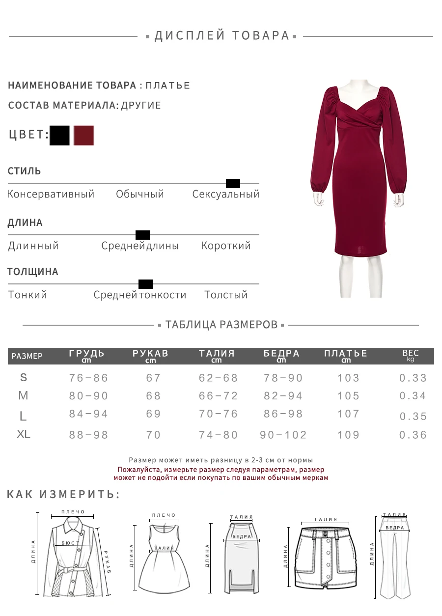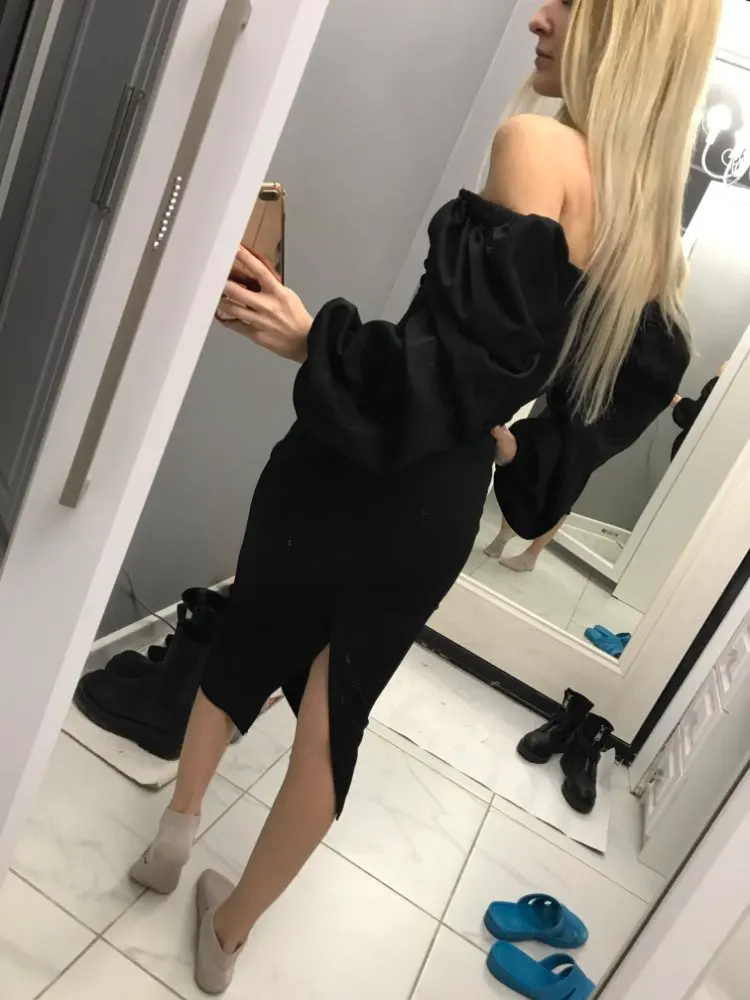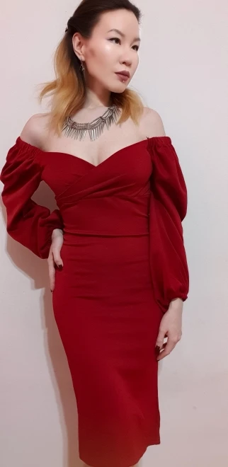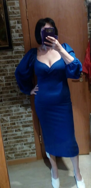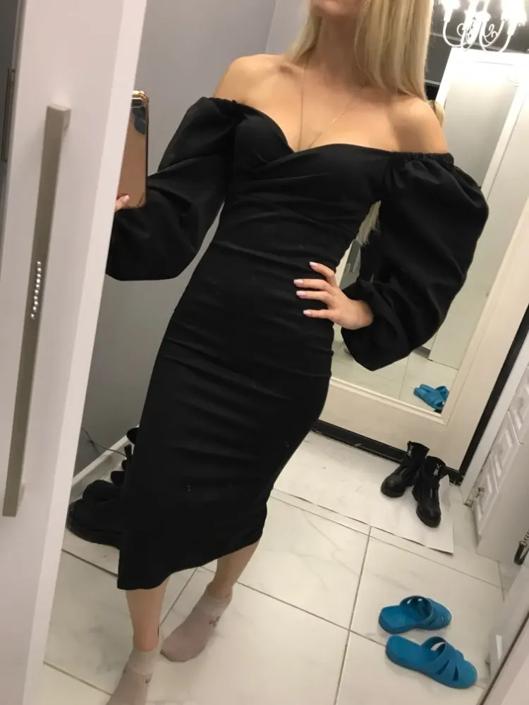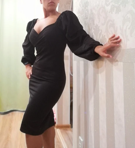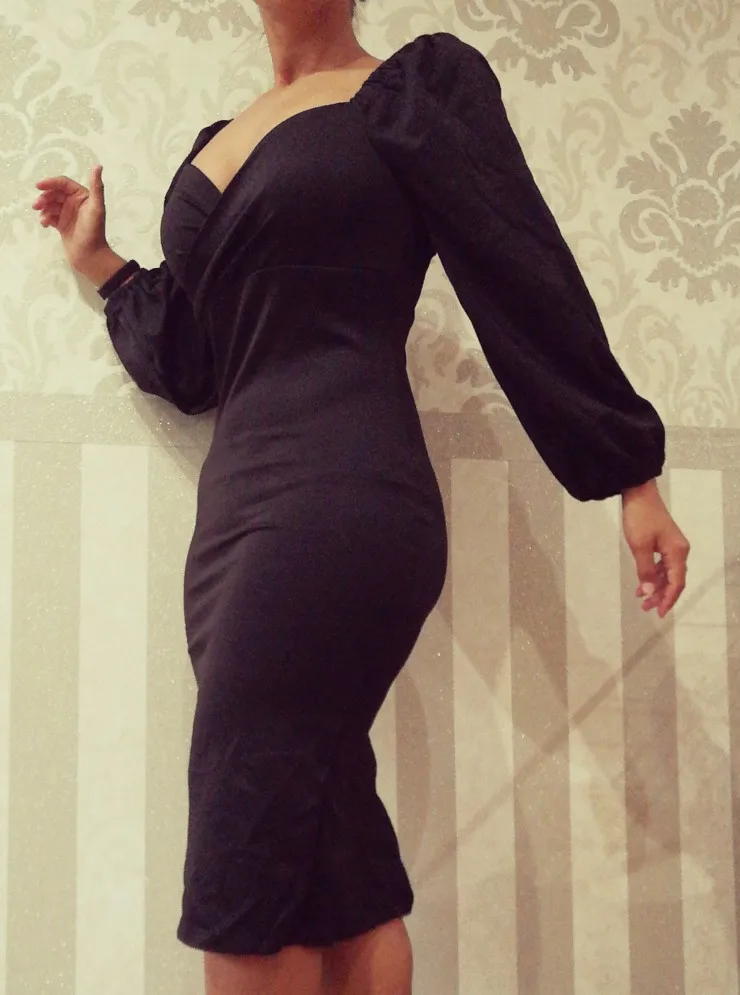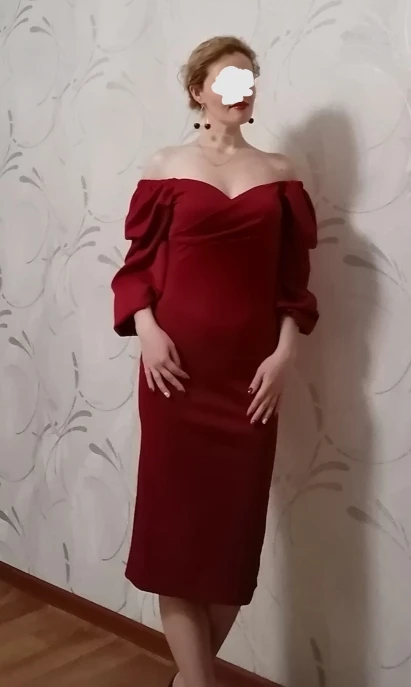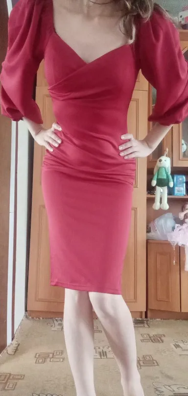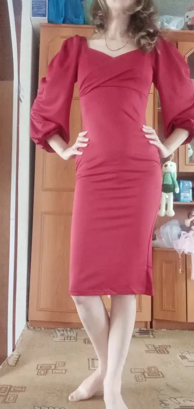 Очень красивое платье с пышными рукавами и соблазнительным аккуратным декольте. Соответствует описанию. На свои параметры ог 91, от 63, об 92 при росте 160 см взяла размер М, чтобы не так сильно обтягивало. Обычно ношу S. По размеру хорошо, меньше не хотела бы, только резинки на плечах чуть свободно, не плотно сидят. Ткань средней плотности, умеренно тянется, не просвечивает, но на мой вкус хотелось бы плотнее. Сзади шлица. В целом платьем довольна) Супер быстрая доставка plus: в г. Пермь всего за 7 дней.