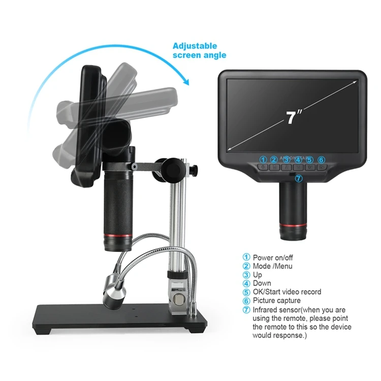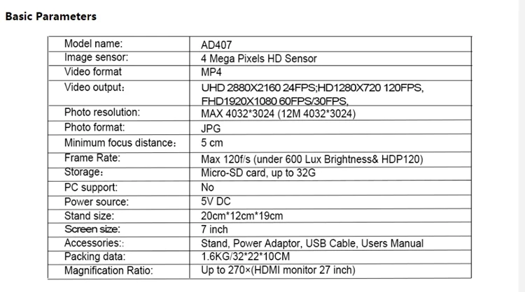 Датчик изображения: HD-датчик 4 мегапикселя Увеличение: до 270 × (монитор HDMI 27 дюймов) Видеовыход: UHD 2880X2160 24FPS; FHD1920X1080 60FPS/30FPS, HD1280X720 120FPS Формат видео: MP4 Разрешение фото: макс. 4032*3024 (12 м 4032*3024) Формат фото: JPG Выход: HDMI, TF-карта (не входит в комплект) Поддержка ПК: нет Размер экрана: 7 дюймов Подставка для микроскопа: может двигаться вперед и назад Минимальное расстояние фокусировки: 5 см Источник питания: 5 В постоянного тока Размер подставки: 20 см * 12 см * 19 см