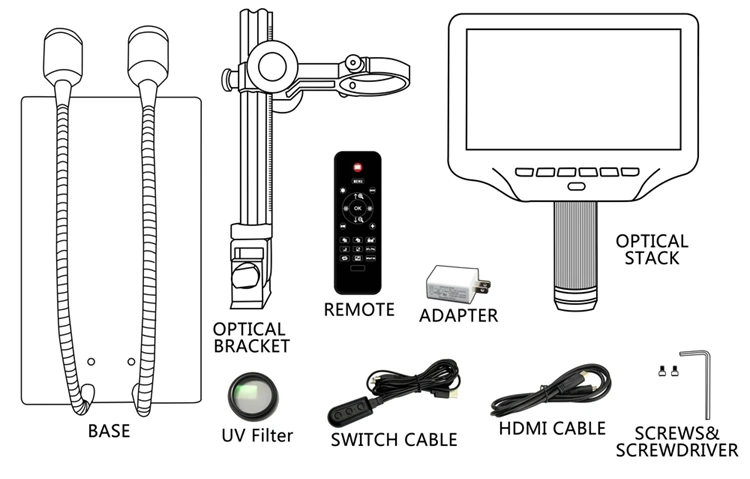 Микроскоп x1 Подставка x1 Кабель HDMI x1 Кабель переключателя x1 УФ-фильтр x1 ИК-пульт x1 (батарея в комплект не входит) Адаптер x1 Руководство пользователя x1