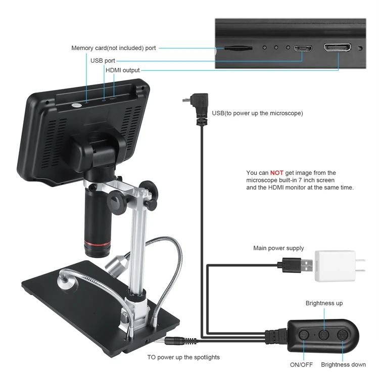 1: собственный Встроенный монитор микроскопа; 2: через TF-карту Вставьте TF-карту в устройство и сделайте фото и видео. Обратите внимание, что микроскоп не поставляется с TF-картой, приобретайте его отдельно. 3: через HDMI FHD монитор, если у вас есть, вы можете подключить микроскоп к HDMI монитору через HDMI кабель.
