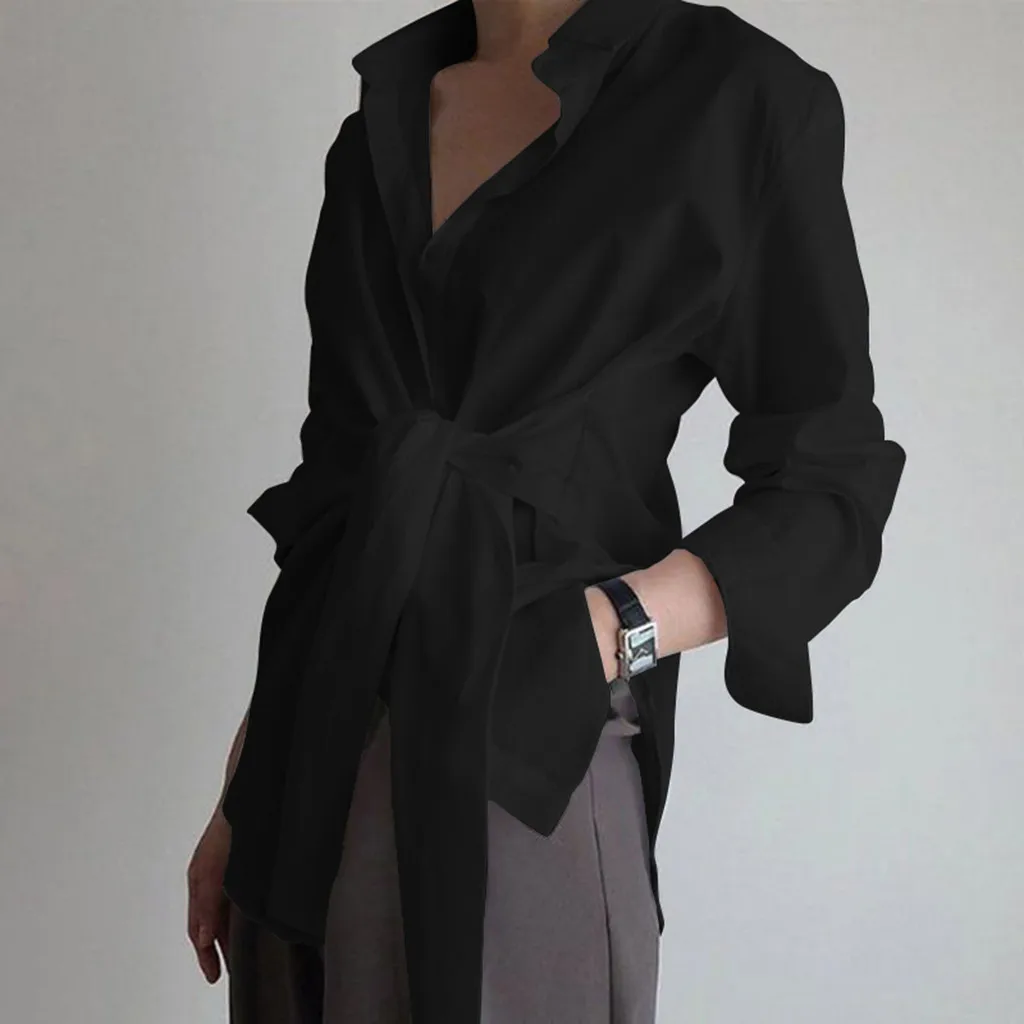 Женская модная однотонная офисная блузка на шнуровке с длинным рукавом и глубоким V-образным вырезом, дамские свободные Осенние Топы