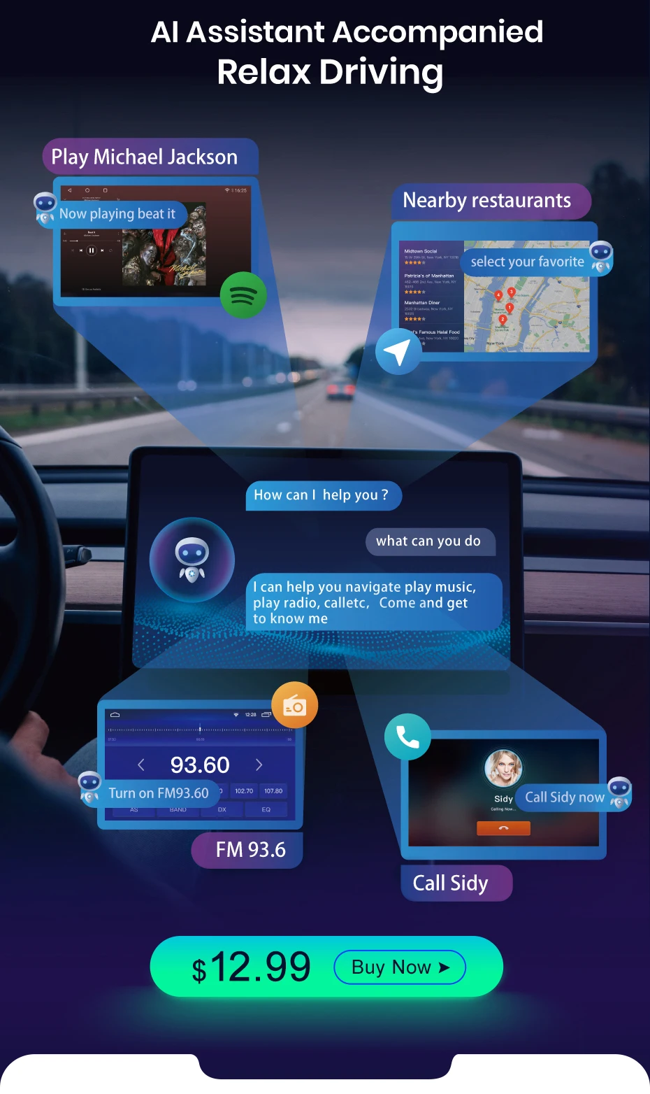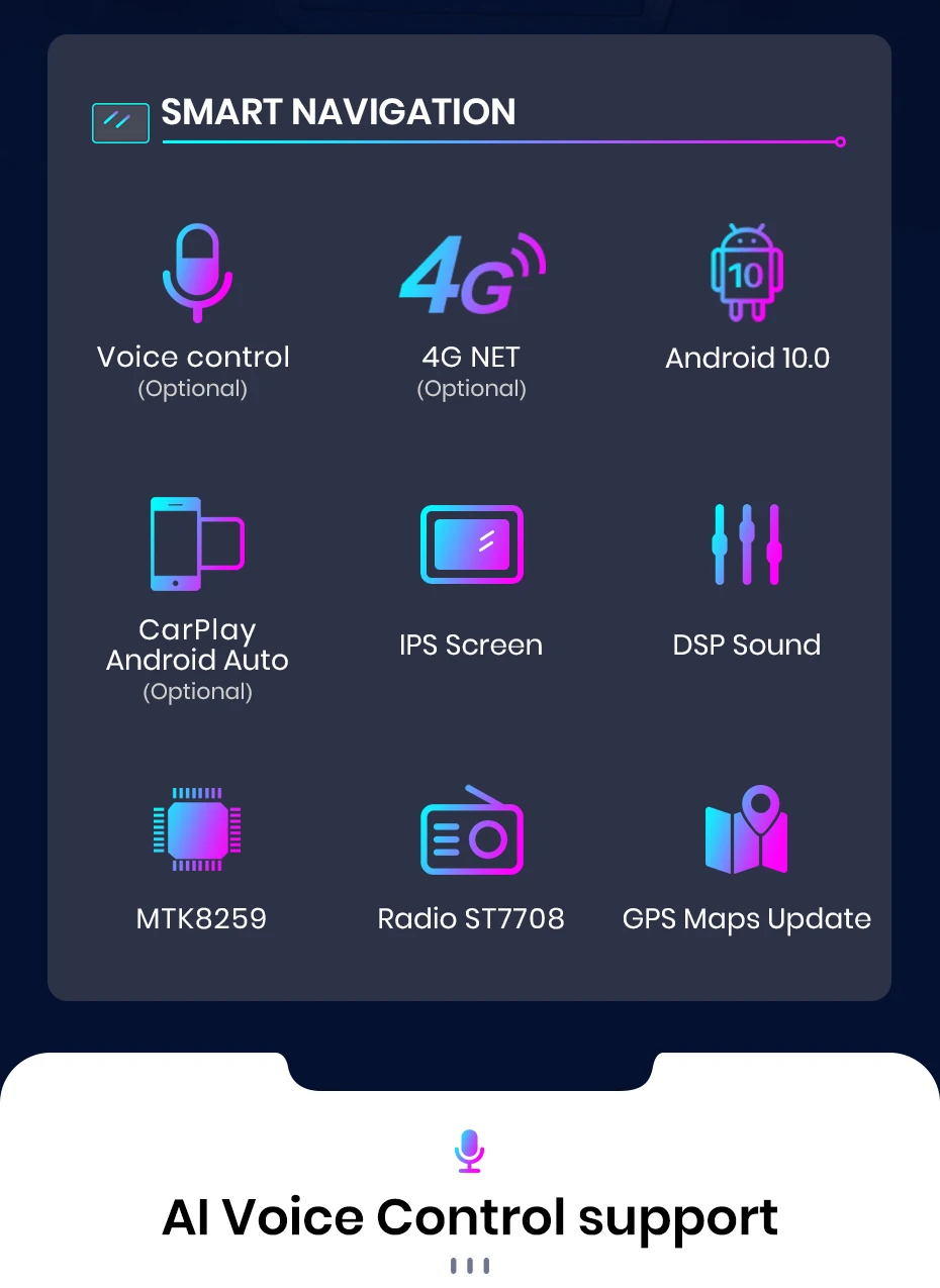 Support AI voice controlAllow you to make phone calls, navigate, play music... (Optional)