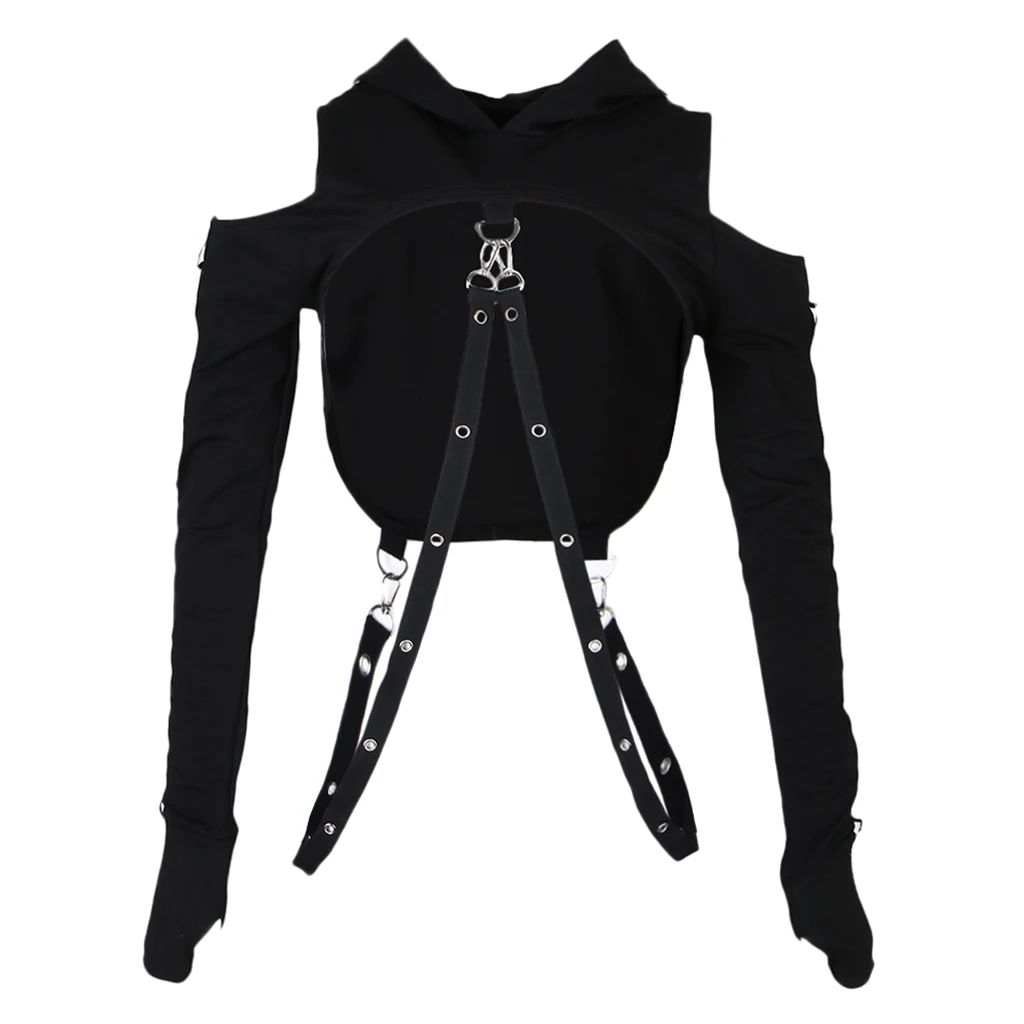 -Стиль: серебристая металлическая круглая пряжка, толстовки с длинными рукавами, укороченный топ, уличный стиль, с открытыми плечами, с отверстиями, ажурные, комбинированные, необычные, темно-черные.