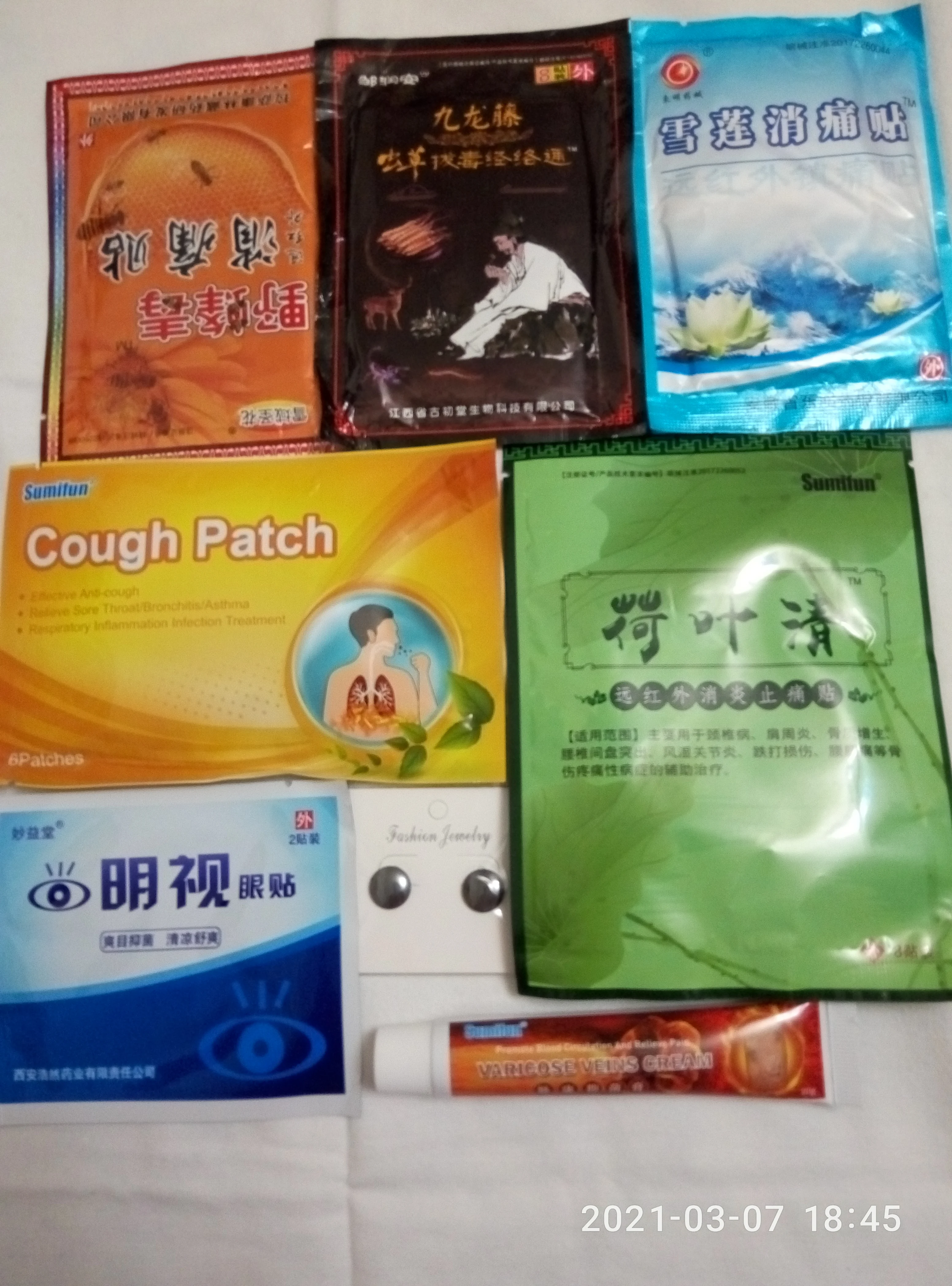 Доставка 35 дней до Украины. Заказывала много пластырей и мазь от варикоза. Пластыри классные, пользуюсь более 15 лет, покупала еще когда была в Китае. Они практически все интентичные, только упаковка разная. Помогают при любой суставной и мышечной боли. Ношу по 2-3 дня, моюсь с ними,держатся крепко. На снимке магнитные сережки для похудения. О результате их действия и действия мази напишу дней через 30-40. Будет видно есть результат или нет. Пластыри однозначно рекомендую! С продавцом не общалась Не понравилась только упаковка- один тонкий пакет.