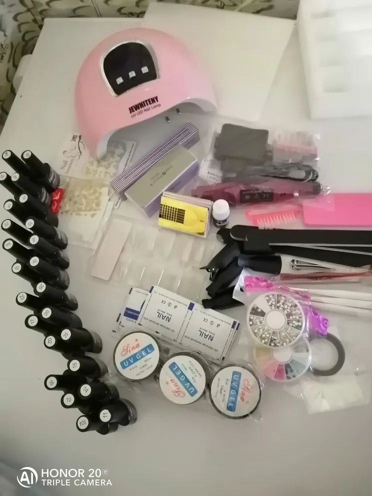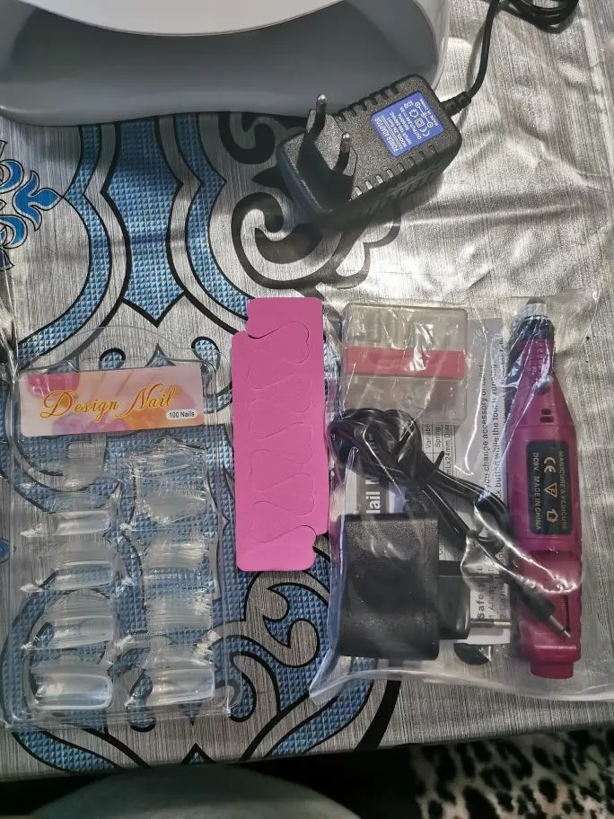 Сегодня получила свой заказ. Все было хорошо упаковано, ничего не пролилось, поскольку склад был российский цвета были высланы случайные. В целом комплектом довольна, маникюрная машинка работает. Лампа сушит, но мне она кажется маломощной, сушит примерно 2-3 минуты.