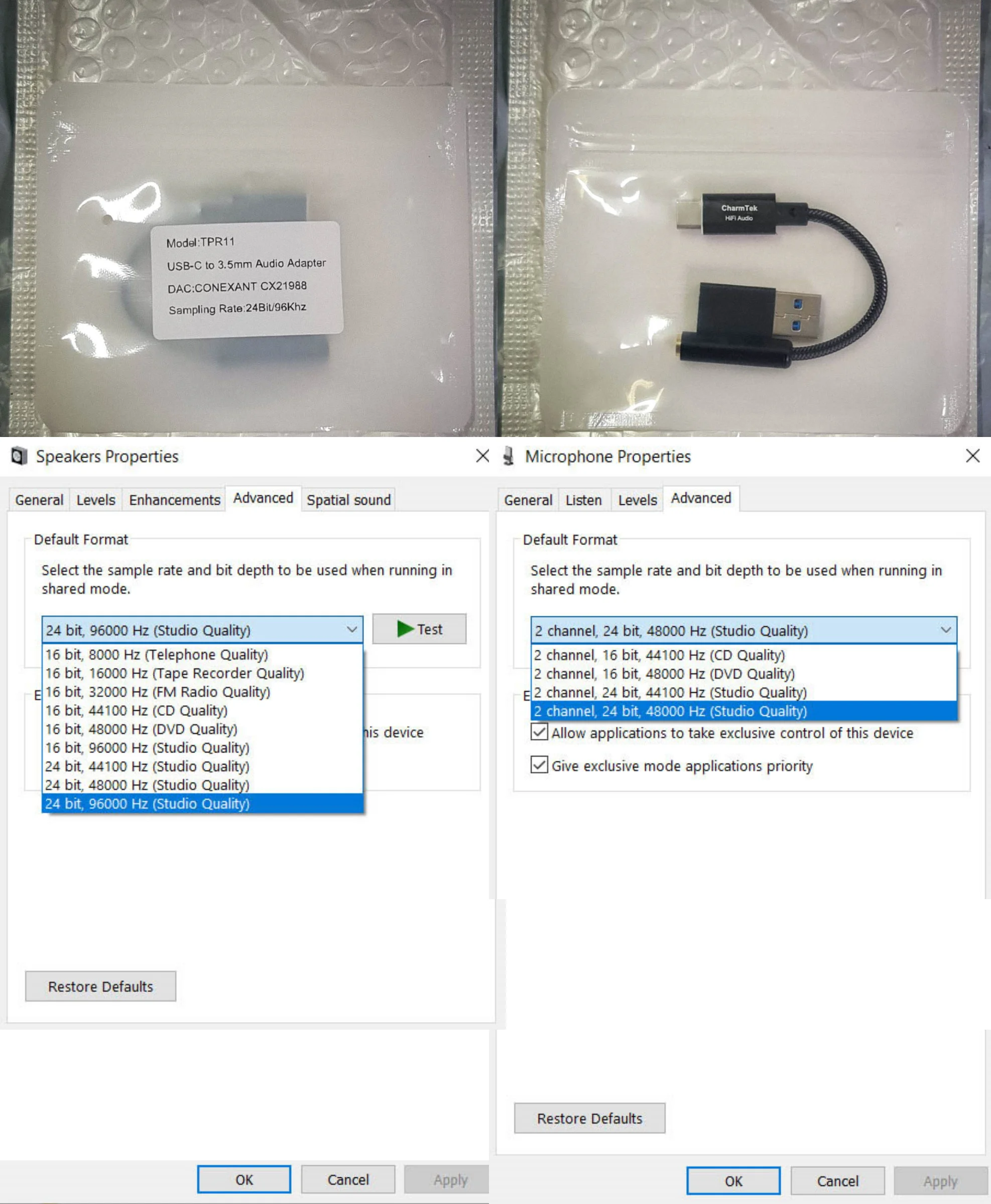 После использования других коннекторов (384 кГц, а также 96 кГц) я пришел к сведению, что наши уши не находят, что они действительно сильно отличаются, чтобы действительно играть в HI FI, вам нужно скачать HI FI, который не так легко доступен в Интернете. Я купил этот разъем CX21988, надеясь получить хороший вход микрофона через него, и да, он имеет лучшее качество для микрофона (2 канала, 24 бит 48000 кГц) по сравнению с другими разъемами. Мне нравится этот разъем, работает на Windows 10 и Note 20 Ultra. Я протестировал его вместе с моим новым прибывшим KZ AS10 и человеком, я могу сказать вам, что это хорошо. A + + +. Настоятельно рекомендуется, если вы ищете разъем хорошего качества, предлагающий выход и вход хорошего качества. 5 звезд продукции 5 звезд обслуживания. Я вернусь.