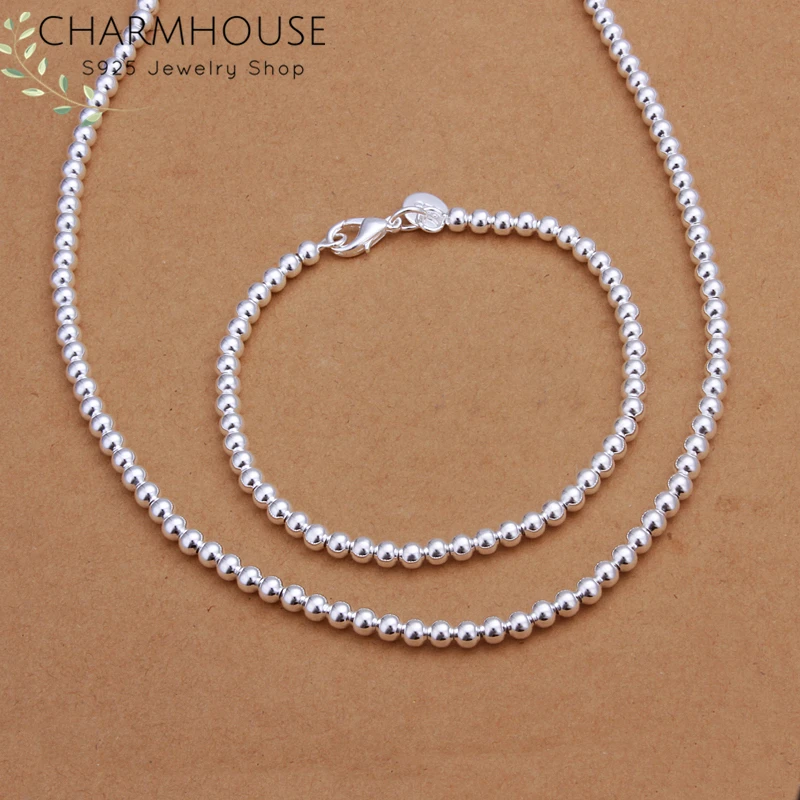 Комплект ювелирных изделий Charmhouse из серебра 925 пробы, 4 мм, бусины, цепочка, ожерелье, браслет, колье, комплект из 2 предметов