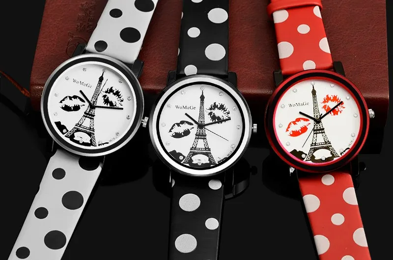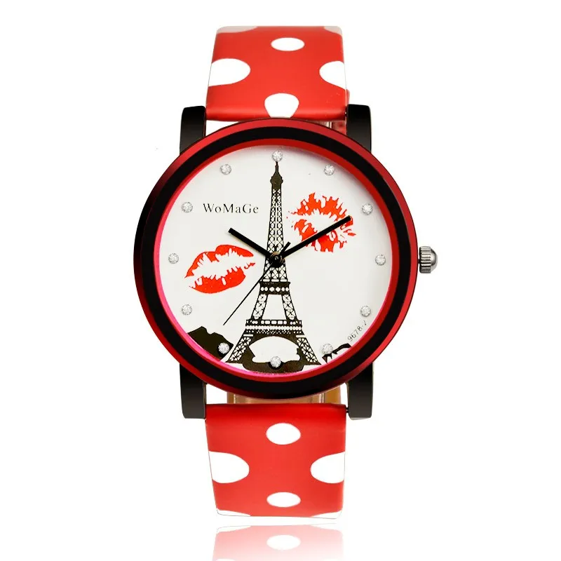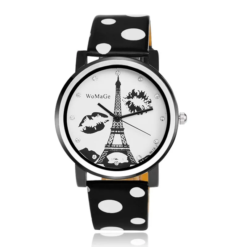 Часы женские, кожаные, в горошек, с Эйфелевой башней