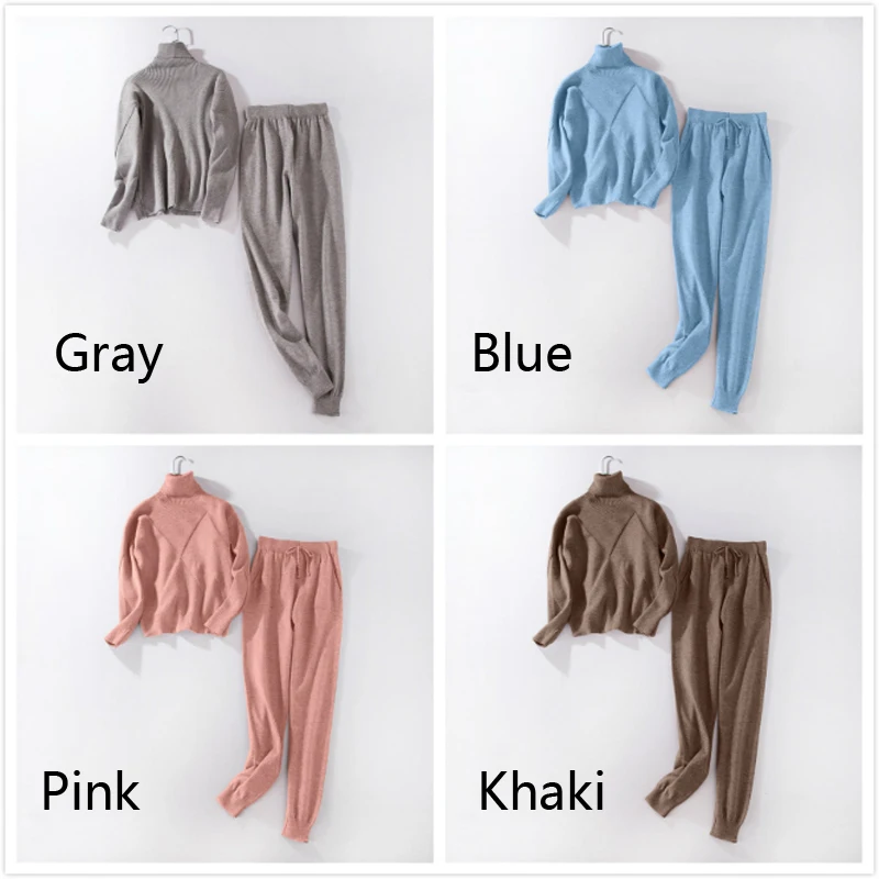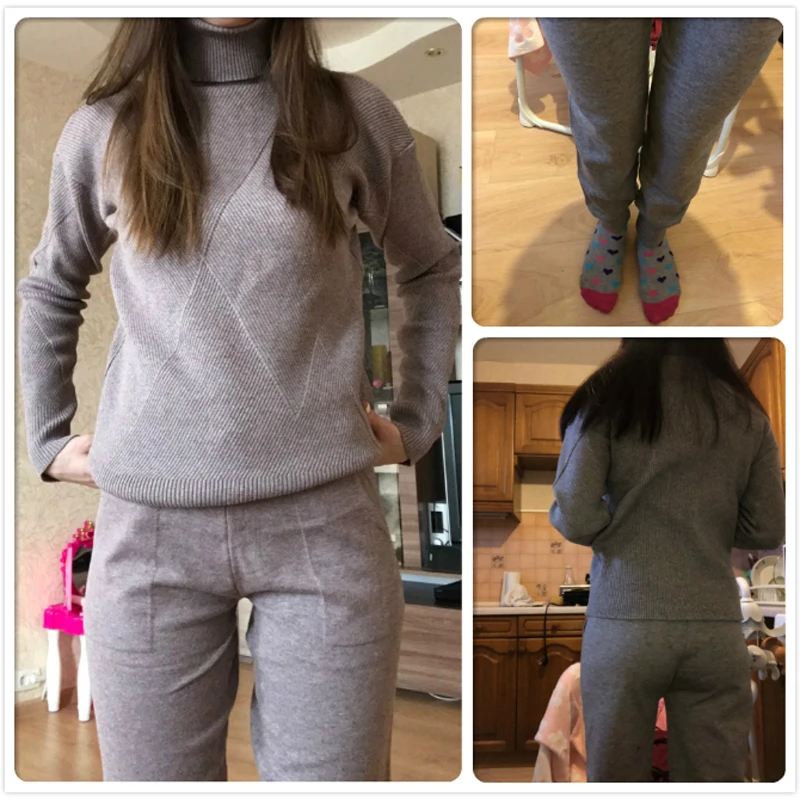 Осенне-зимний теплый шерстяной вязаный спортивный костюм для женщин, пуловер с высоким воротом и брюки, Женский Повседневный комплект из двух предметов