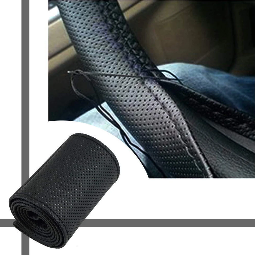 Кожаный чехол для руля 37-38 см, черный чехол для руля с иголками и ниткой, чехол рулевого колеса автомобиля, 1 комплект