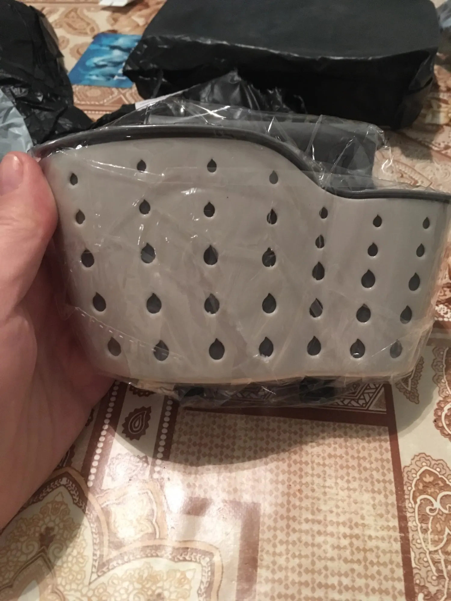Пришло на удивление быстро. Хороша ёмкость на губки, достаточно просторная, удобно крепится, материалы неплохие, но могли быть лучше. Вообще рекомендую, на кухне стало гораздо удобнее, полезная штука!