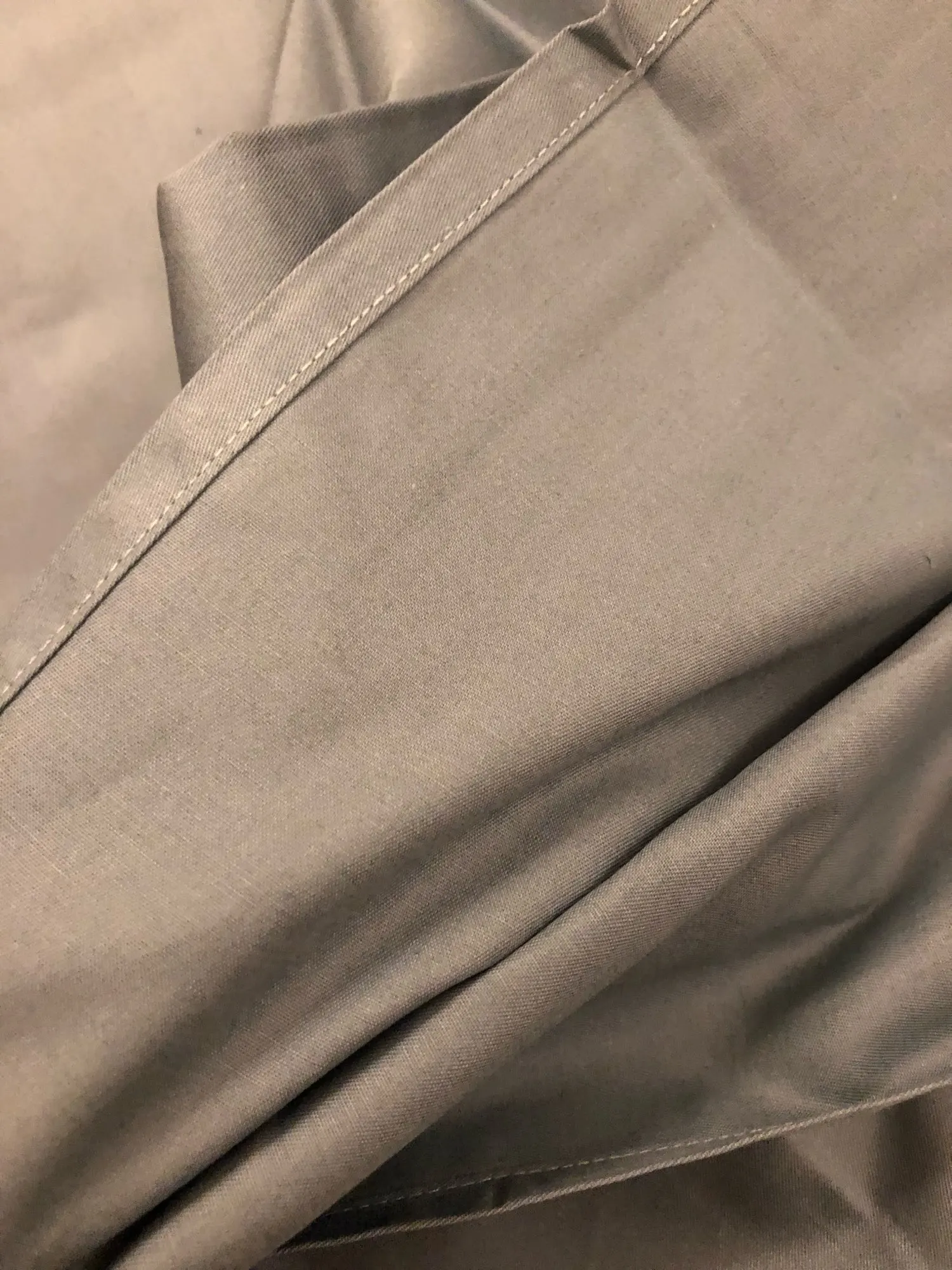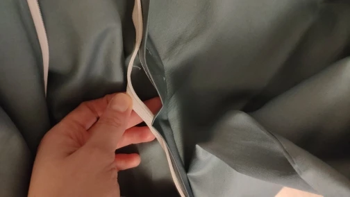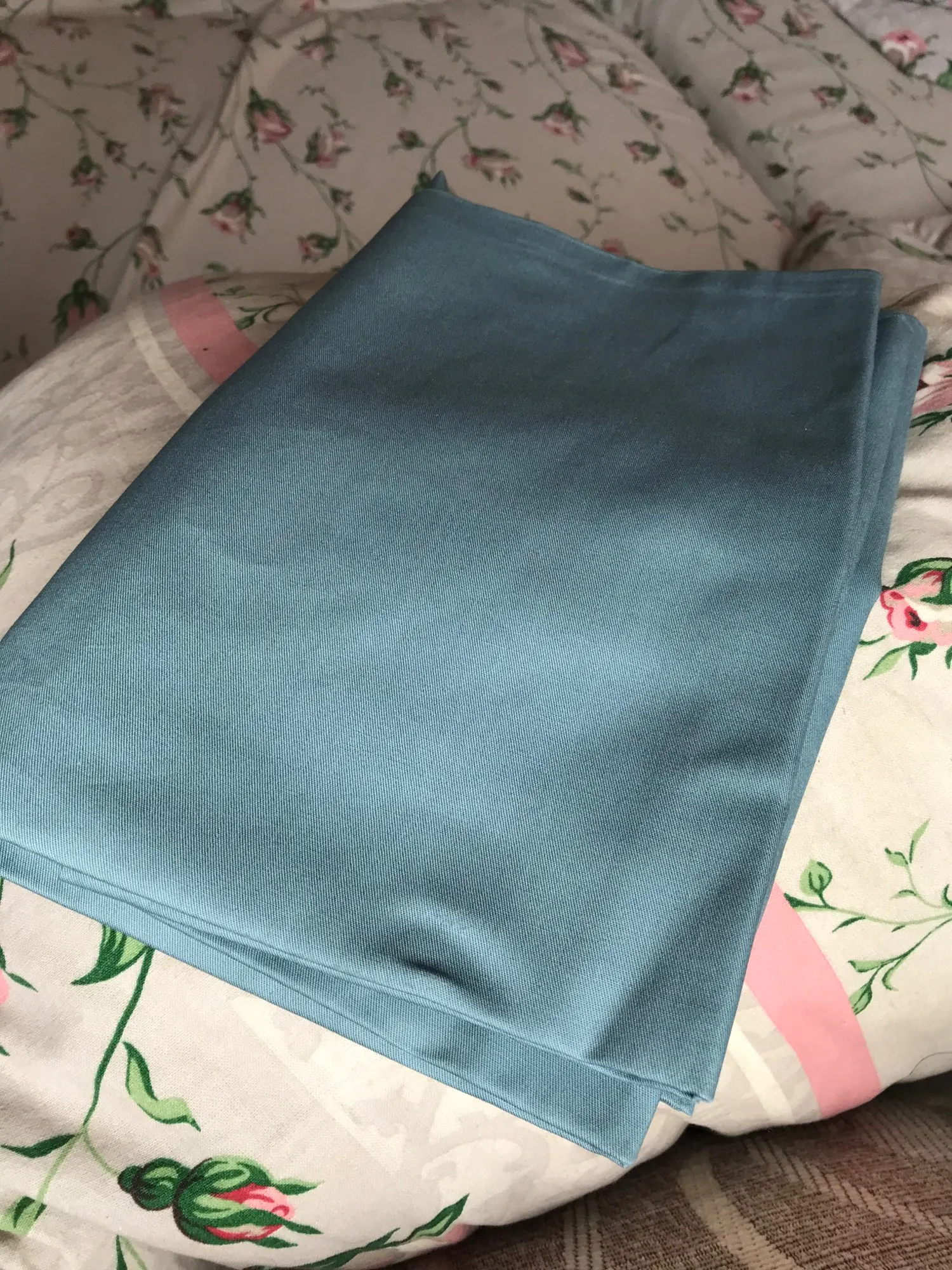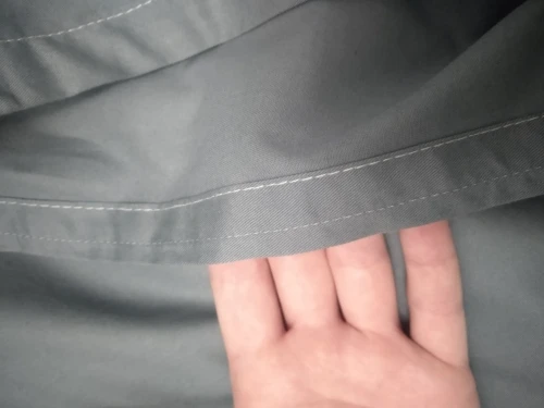 Ткань на ощупь приятная, гладкая. Нет потустороненго запаха. Цвет немного отличается от картинки, ближе к серо-голубому а на не серо-бирюзовому. Швы снаружи все ровные, кое где торчат нитки от оверлога, не критично.