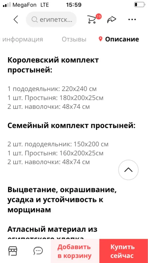 Написано, что простыня высотой 25 см, моя ощутимо меньше, еле как налезла на матрас и то не до конца. Качество ткани вызывает вопросы, если это натуральный хлопок, почему стирка при 30 градусах на ярлыке? для постельного белья недостаточно, пылевые клещи гибнут при темпера от 60 градусов. Цвет приятный, наощупь не очень гладкое, шершавое. не "атласный", как заявлено. Продавец нормальный, отвечал на вопросы. Цена мне кажется завышенной и непонятны совсем супер-восторженные отзывы.