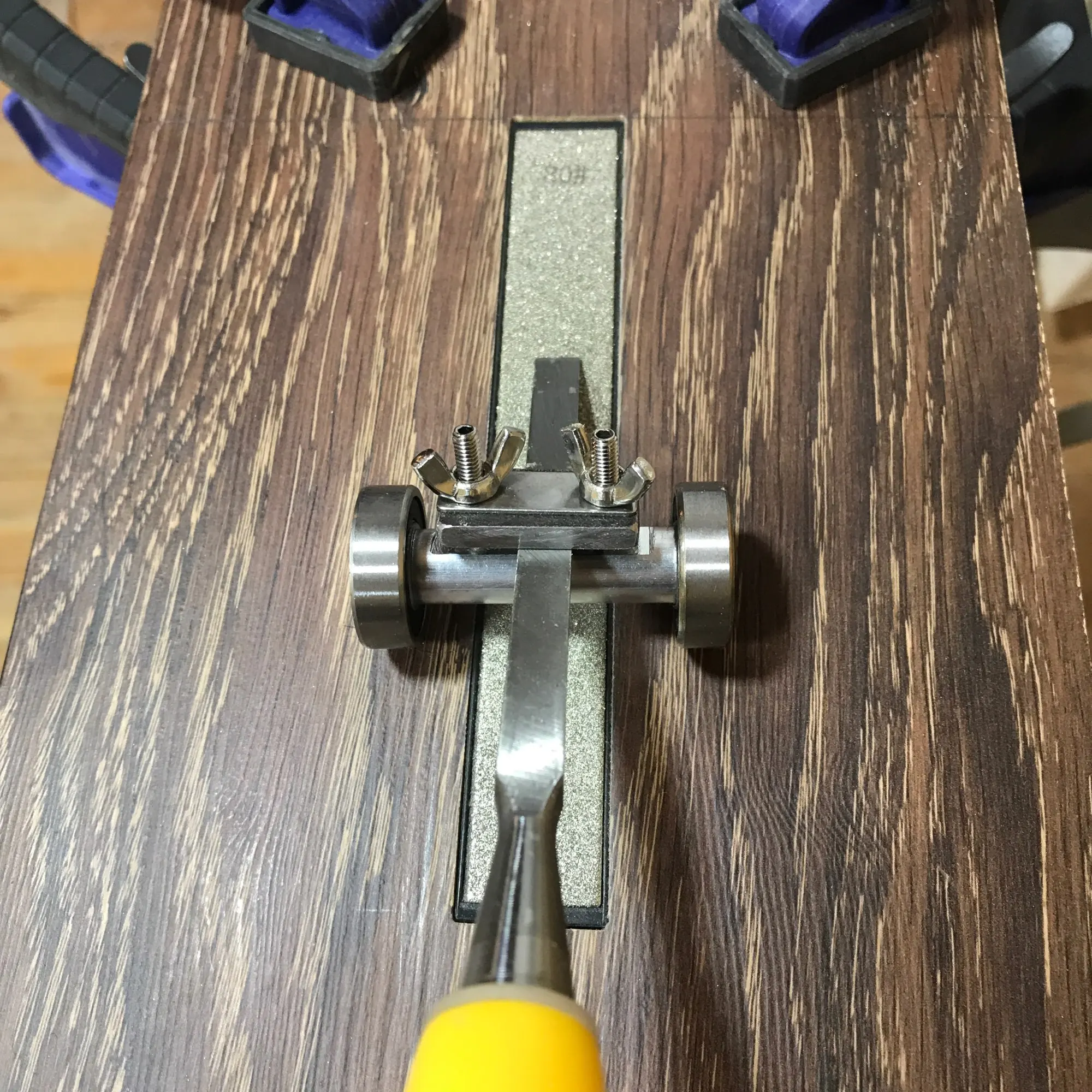 Подходит только для тонких стамесок, моя ходовая 19мм не влезла, прижимная пластина из тонкого металла, угол между стамеской и точилкой выставляется руками и всегда гуляет. Что легко проворонить и уведёт её. Вывод - игрушка и для прямого назначения не подходит.