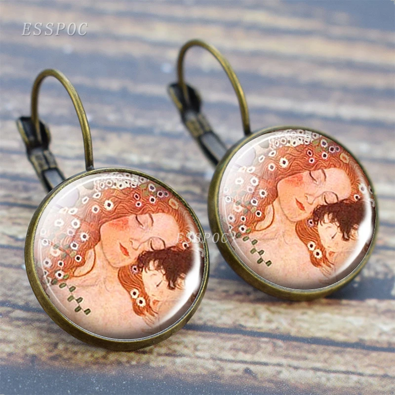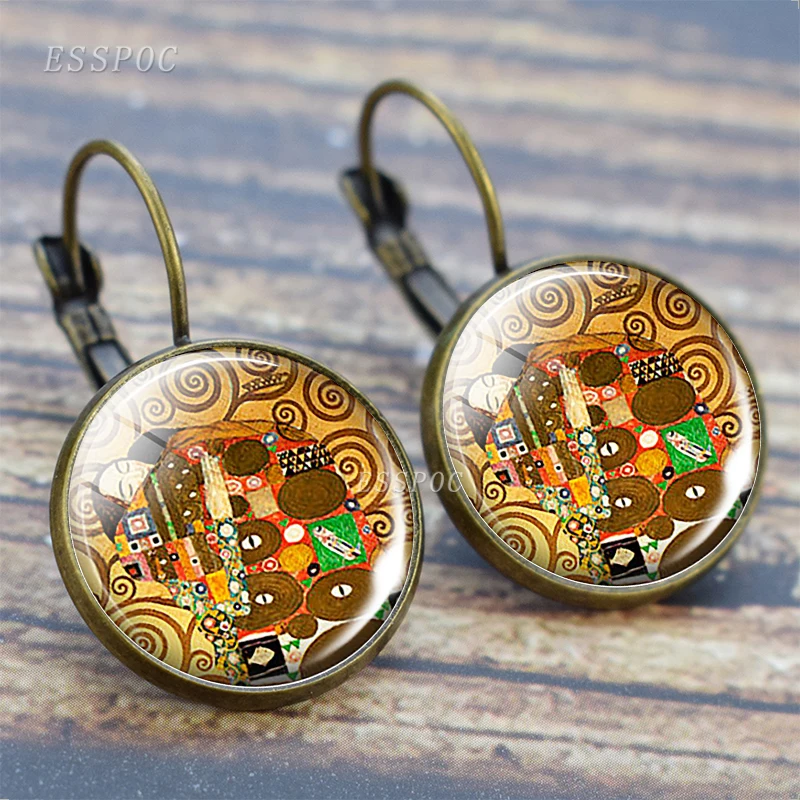 Ретро серьга Климт Франция серьги-гвоздики искусство картина маслом бижутерия со стеклянными кабошонами поцелуй Климта мамы день матери застежка-крючок подарок