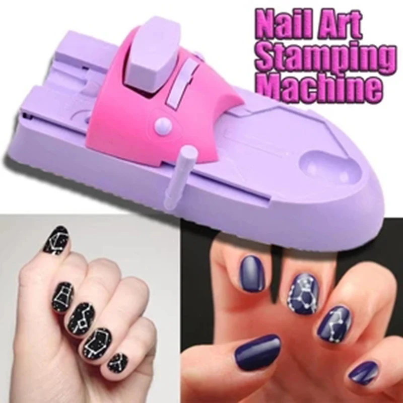 Тип: машина для печати ногтей Материал машины: пластик Материал узорной пластины: нержавеющая сталь Размер: 19x8.3 см/7,48x3,27 ''(прибл.) Цвет машины: розовый и фиолетовый Количество: 1 комплект