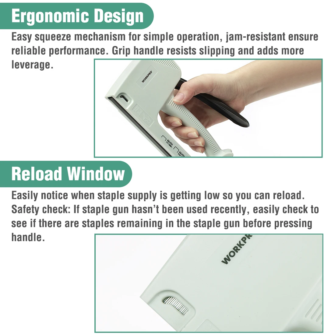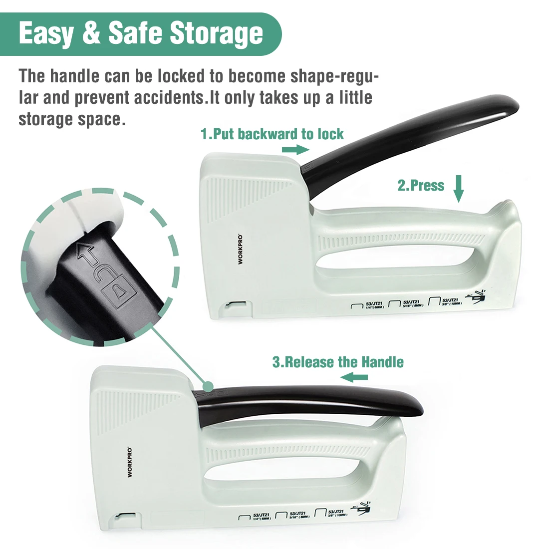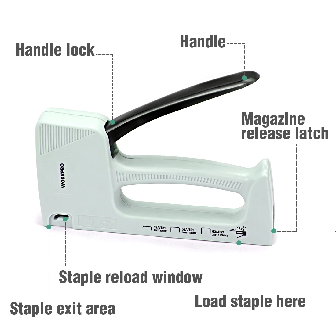 Пистолет для гвоздей WORKPRO светильник, ручной степлер, гвоздезабивной инструмент для мебели, пластиковый степлер с 800 скобами 6 мм8 мм10 мм и съемником скоб