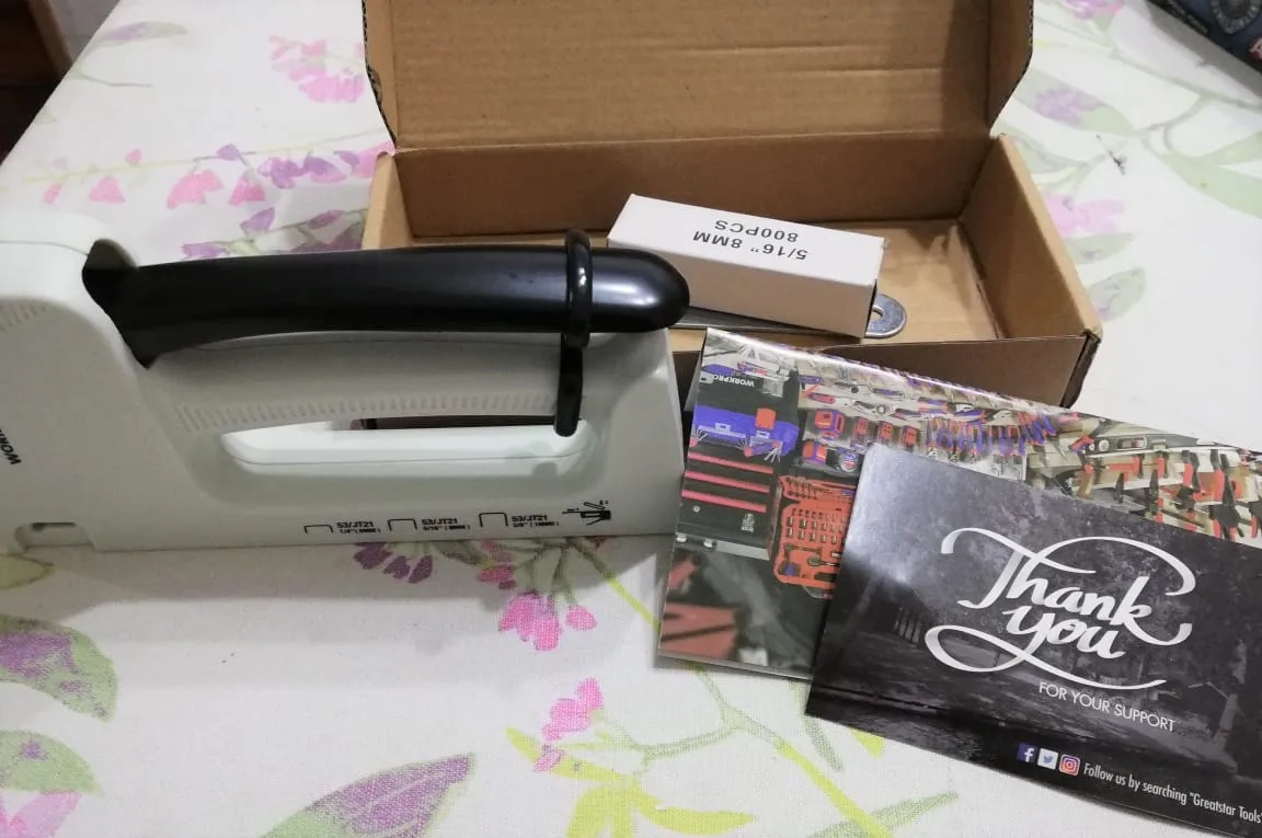Доставка за 2 невероятных дня, пистолет идеален, он мало весит, он работает очень хорошо, ничего не стоит, чтобы прибить кисти, отлично, я не ожидал этого, но это замечательно. Быстрая доставка, хорошее качество, поставляется в своей коробке с 800 скобами и шарфом. Я рекомендую 100%