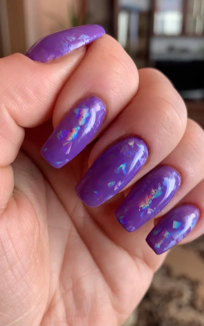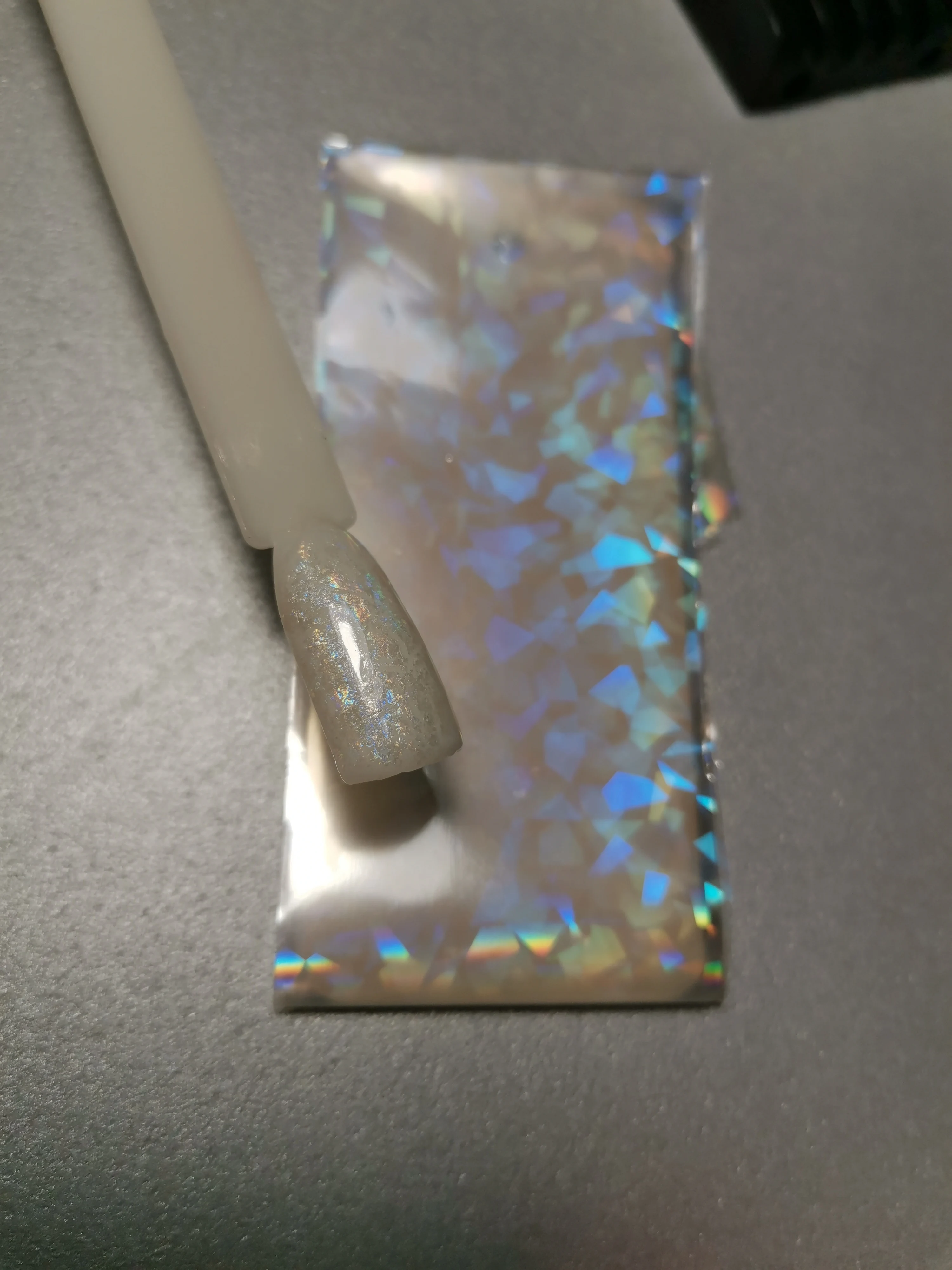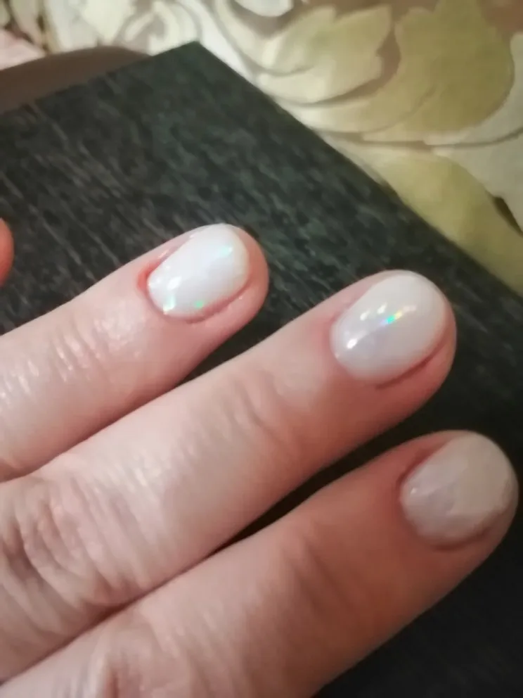 Фольга очень классная! Мне понравилась! Отпечатывается на липкий слой. Вот вам фото, это фольга отпечатана была на липкий слой камуфлирующей базы! Рекомендую 100%! P.s.: хорошо перекрывайте топом особенно у основания, иначе может отойти
