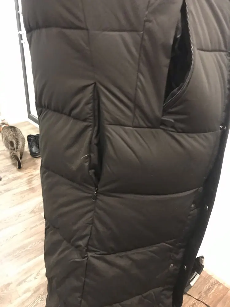 Хороший добротный пуховик. Заказывали на талию, бёдра 115 см, вес 95, рост 172 размер XXL, отлично по размеру - есть немного места для тёплой одежды. Доставка отслеживалась на всём пути. Все строчки прошиты, пуговицы и замок на месте. У пуховика огромное количество карманов: 2 больших внутренних, 4 внешних. Набивка плотная. Капюшон сплошной (без молнии), так что шею не задует, молния вдоль пуховика прикрывается дополнительной зашитой на пуговицах. Мерили в -8(октябрь), было тепло. Рекомендую!