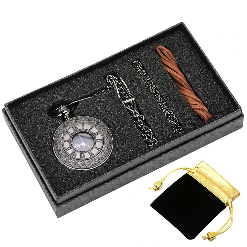 5 шт.компл. винтажные черные унисекс римские цифры Кварцевые в стиле стимпанк карманные часы коробка набор ожерелье кулон подарочные сувениры для мужчин и женщин