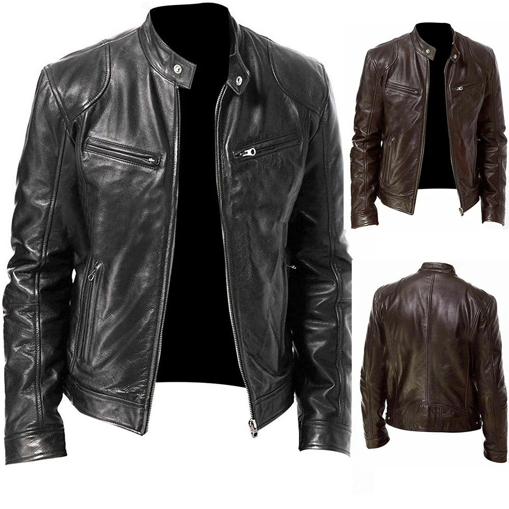 Куртка мужская из искусственной кожи, модная мотоциклетная куртка-бомбер с воротником-стойкой, черная коричневая, на осеньзиму