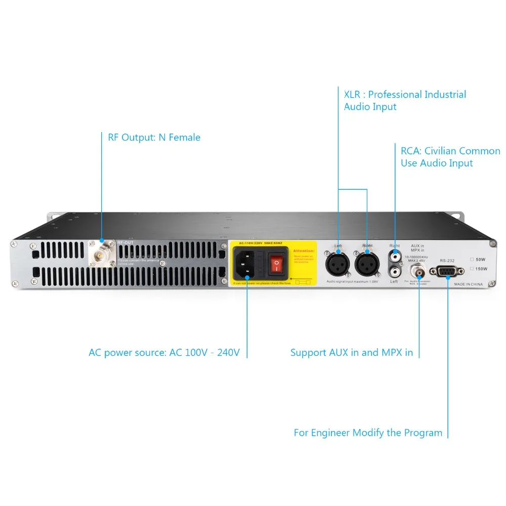 Они широко используются для профессиональных радиостанций для передачи высококачественных FM-радиопрограмм.Особенности:●Это продукт серии FMT 5 поколения, все цифровые технологии DSP + PLL, лучшее качество звука.●Обновление частоты до 50 кгц.●Тонкое мастерство, Стандартный 19 дюймов, цельная шкафчик из алюминиевого сплава 1U. Проволока и окисление делают поверхность яркой, чистой и элегантной.● Большой ЖК-дисплей отображает все параметры в реальном времени. Отображает рабочую частоту, объем, температуру фетмоса, прямую мощность и КСВ.● Оснащен серией функций защиты, собственной активной защиты и поднятия сигналов тревоги после того, как возникнут какие-либо проблемы во время работы.● Точный индекс работы и идеальные меры защиты позволяют вам лучше понимать рабочее состояние вашей машины.● Простая установка и простота эксплуатации.●Высокое качество и отличные технические характеристики. Схема AGC для поддержания стабильности выходной мощности.● Каждая машина была строго проверена серией проверки качества и проверки функций, чтобы гарантировать наилучшую эксплуатационную функцию.Технические характеристики:-Напряжение питания: 90 В ~ В переменного тока, 50 Гц ~ 60 Гц-Эффективность мощности: ≥ 60%-Режим отвода тепла: ветер-Радиочастотный диапазон: 87,00 МГц ~ 108 МГц, шаг 50 кГц-Выходная мощность RF: 0 ~ 50 Вт, регулируемая-Выходное сопротивление RF: 50 Ом-Выходной разъем RF: N (гнездо)-Точность несущей частоты: ± 200 Гц-Гармоническое подавление:>65 дБ-Паразитная Амплитудная Модуляция:<-50 дБ-Отклонение частоты модуляции: ± 75 кГц (модуляция 100%)-Разъем аудиовхода: RCA (несимметричный), XLR (балансный)-Предварительный звук: 0 μs 、 50 μs 、 70 μs-Разница уровня справа и слева: <0,01 дБ (модуляция 100%)-Сигнал-шум: 75 дБ, 1 кГц (модуляция 100%)-Звуковой отклик: ± 15000 дБ, 10 Гц ~ МГц-Искажение: <0.1%,10 Гц ~ 15000 МГц-Стерео разделение: 55 дБ, 10 Гц ~ 15000 Гц-Частота пилота: 19 кГц ± 1 Гц-Модуляция пилотной частоты: 8% ~ 10%-Сопротивление аналогового аудиовхода: 600 Ом, баланс-Усиление аналогового аудиовхода:-15 дБм ~ + 15 дБм, Шаг 0,01 дБм