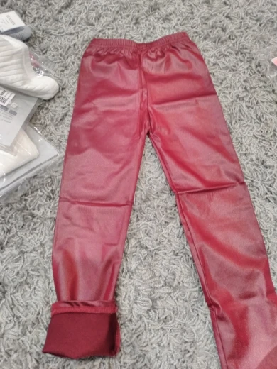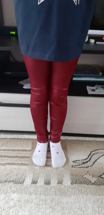 Покупкой довольна. Подошли на девочку ростом 122-124. Чуток есть запас. Кажется что «кожа» но на самом деле это ткань(не толстая). Смотрится интересно. Дочка не хотела снимать после примерки :) Покупкой довольна. Цвет ярко-гранатовый.