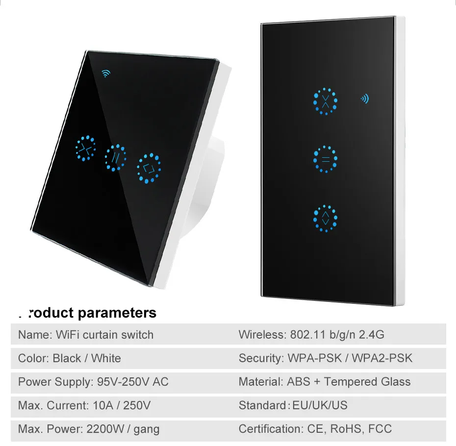 Название: Смарт-переключатель Wi-Fi (смарт-переключатель WIFI для занавесок, затвора, моторной двери) Цвет: черный, белый Источник питания: 90-250 В переменного тока Макс. Ток: 10А/250 В Макс. мощность: 2000 Вт Беспроводная связь: 802,11 b/g/n 2,4G Безопасность: WPA-PSK / WPA2-PSK Материал: АБС-пластик + закаленное стекло Размеры: ЕС/Великобритании: 86*86*34 мм/3,4*3,4*1,34 дюймов Свяжитесь с нами: 120*76*34 мм/4,7*3*1,34 дюйма Сертификация: CE, RoHS, FCC