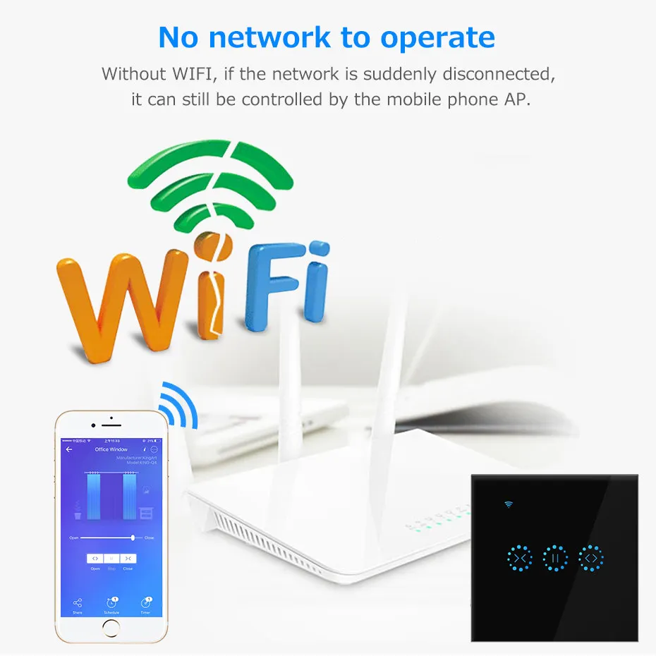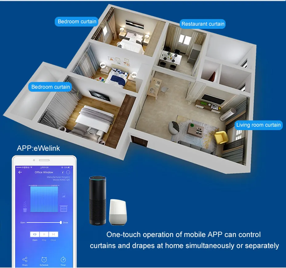 Сенсорное управление: пауза, открытие, закрытие Управление через приложение: пауза, открытие, закрытие % Открытый/закрытый занавес Плановый/таймер/акция Работает с Amazon Alexa Работает с Google Home Работает с IFTTT Дистанционное управление через приложение: используйте смартфон r, чтобы дистанционно управлять открытием/закрытием/Pa, используйте домашние шторы в любое время и в любом месте через приложение, если телефон имеет сеть 2G/3G/4G/WIFI. Это делает вашу бытовую техника умной в течение 1 секунды. Совместим с iOS и Android OS. Загрузка приложения: eWeLink.